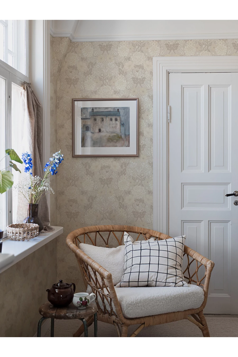 Meleg bézs és világos semleges árnyalatokkal átitatva, a Dahlia Garden tapéta a nyugodt kert oázisának lényegét ragadja meg. A bonyolult dália és kozmosz virágok finom lombkoronával fonódnak össze, hogy megnyugtató és természetes hatású mintát alkossanak. Ez a tapéta színvilága ideális azok számára, akik a Dahlia Garden tapéta visszafogottabb változatát keresik; a mosott len és bézs tónusok könnyen kombinálhatók a szoba egyéb dekorációival. A tapéta meleg árnyalatai otthonos és hívogató légkört teremtenek, így kiváló választás hálószobába és nappaliba egyaránt.