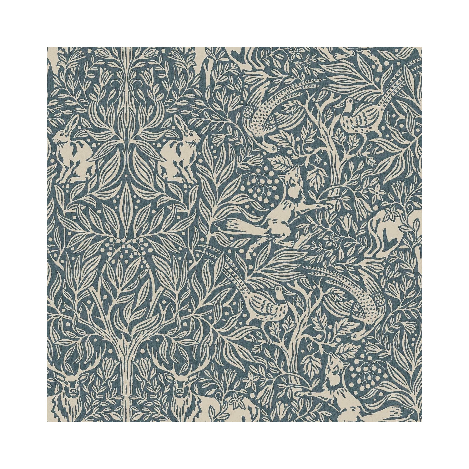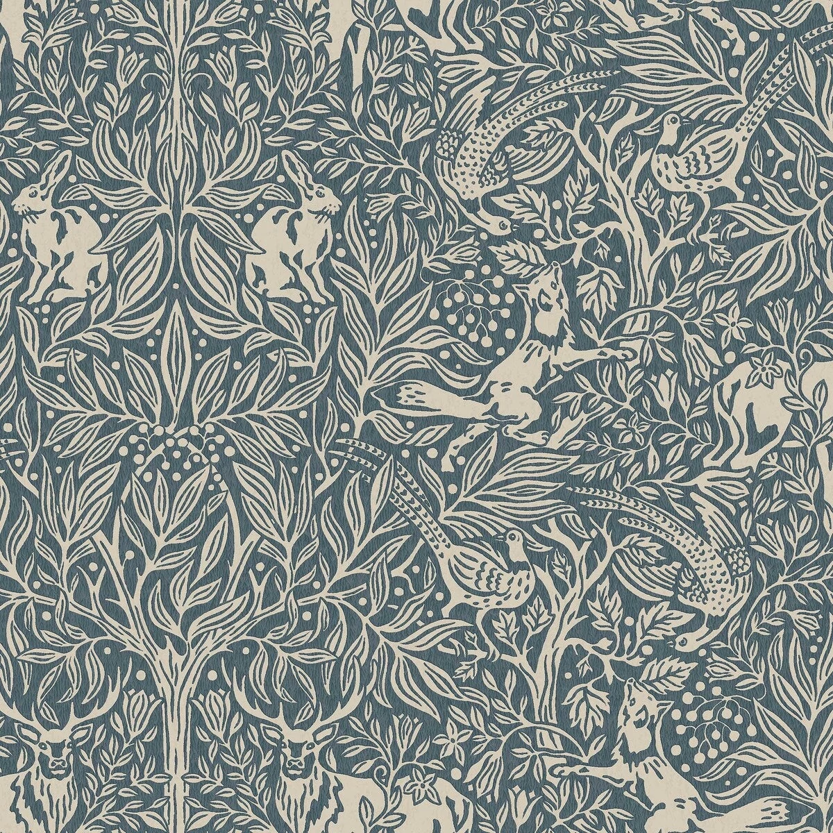 Sötét acél petrolkék és bézs kontrasztos árnyalataiban színezett Under the Elder Tree tapétánk élet örömei kerülnek a középpontba. Egy méltóságteljes szarvas és egy félénk nyúl állnak egy hatalmas bodzafa árnyékában, miközben egy ravasz róka üldözi a menekülő foglyokat, akik menedéket keresnek egy galagonyabokorban. Távolról finom és harmonikus, a dráma és meglepetés akkor tárul fel, amikor szemed a minta részleteire fókuszál. Ragaszd a nappalid étkező részébe vagy a hálószobádba a luxus és nyugalom jegyében.