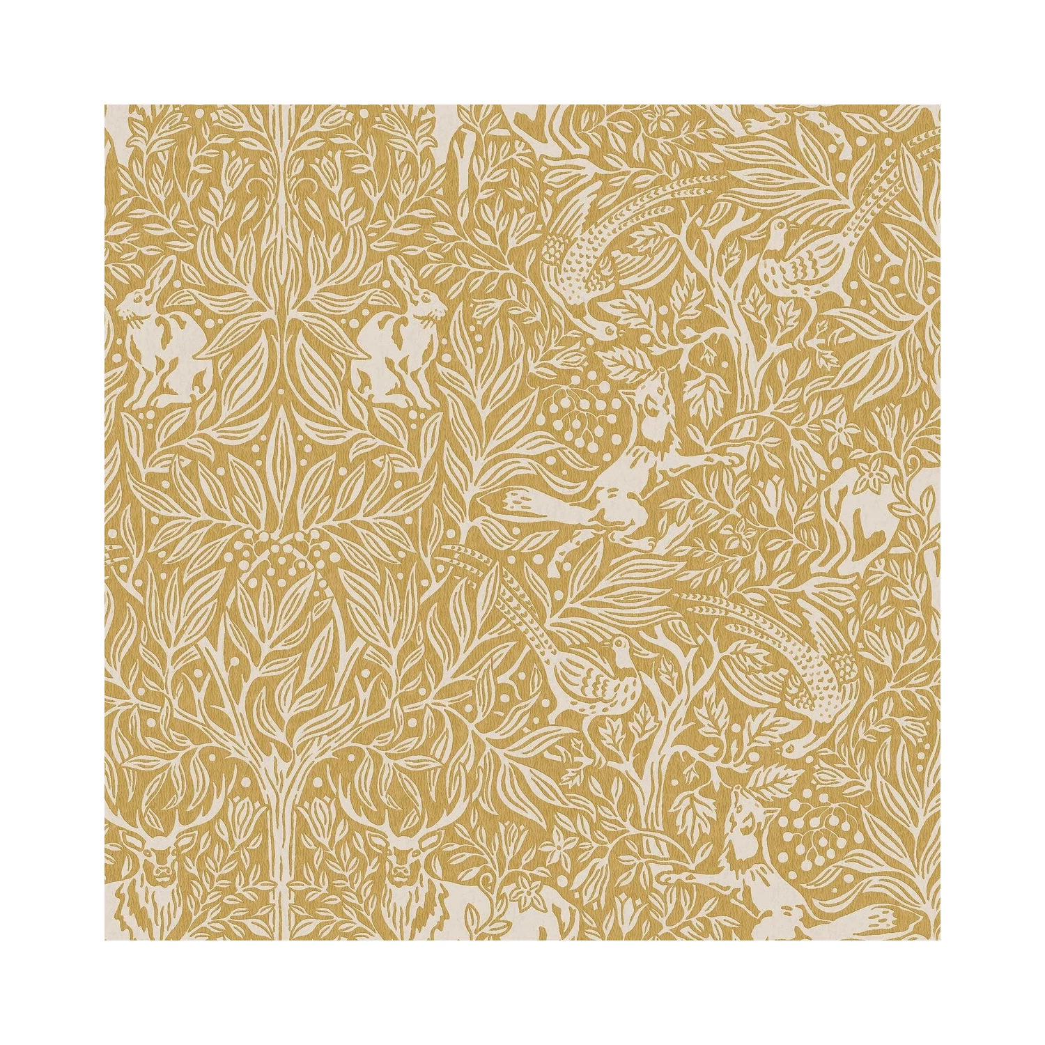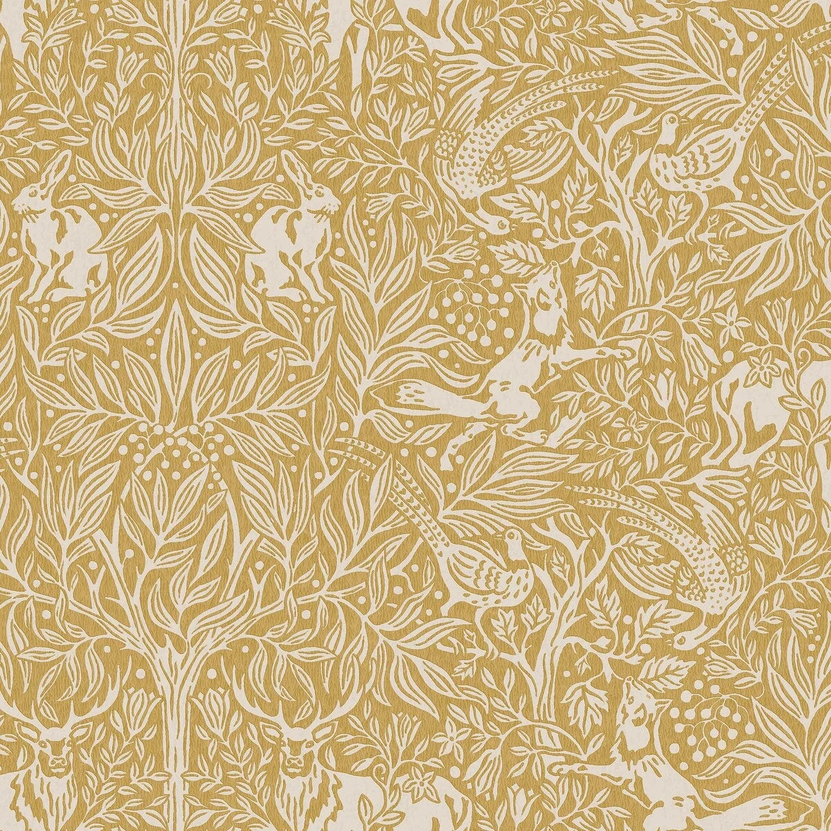 Az Under the Elder Tree tapéta kellemes okkersárga és bézs árnyalatokban pompázik, harmonikus és visszafogott, mégis tele van részletekkel és meglepetésekkel. A hatalmas bodzafa árnyékában egy méltóságteljes dámszarvas és egy félénk mezei nyúl áll, miközben fácánok menekülnek egy ravasz róka elől. Ideális választás hálószobába, nappaliba vagy előszobába, ha nyugodt, mégis érdekes és mélységet sugárzó megjelenést szeretnél.