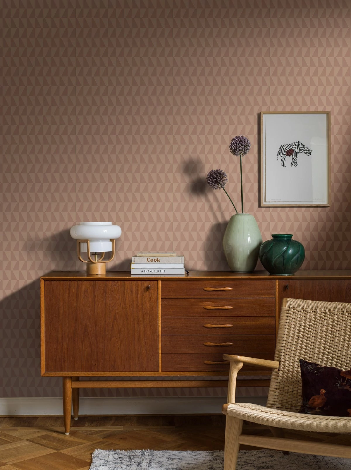 Gyönyörű, tompított rózsaszín árnyalatokban pompázó Trapez tapétánk ismétlődő mintázata ellentétes trapéz alakzatokból áll, amelyek nagyobb négyzeteket alkotnak. Figyelemfelkeltő, absztrakt és sokoldalú, finoman visz színt és dizájnt bármely helyiségbe. Geometrikus mintázatával ideális választás, ha modern hangulatot szeretnél teremteni a nappaliban, az étkezőben vagy a konyhában.