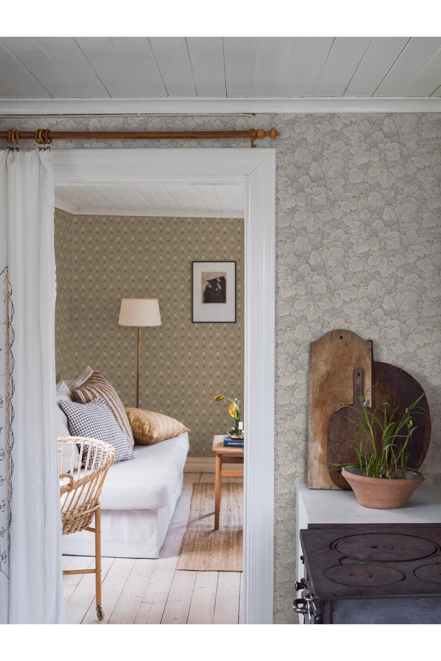 A Waldemar tapéta jeges szürke árnyalataival a vastag, lombos növényzetet ábrázolja, amelyet az év első fagyja érintett. A 19. században népszerű szőttes stílusú esztétikából merítve, virágmintája időtlen eleganciát kölcsönöz a helyiségeknek, ahol megjelenik. Kiemeli a környező belsőépítészeti elemeket anélkül, hogy elnyomná azokat.