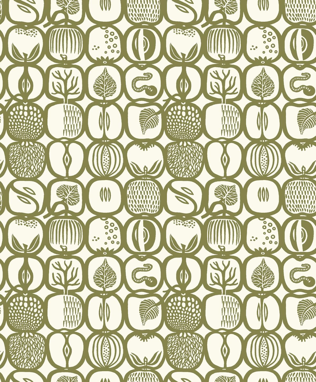 Lágy olívazöld árnyalatban készült Fruktlåda tapétánk játékos stílusával örömet és vidámságot csempész a helyiségekbe. Ez a klasszikus retro gyümölcsmintás mintázat a svéd tervező, Stig Lindberg egyik legnépszerűbb és legkedveltebb alkotása. Ideális választás, ha időtlen és modern skandináv stílust szeretnél varázsolni nappalidba, előszobádba vagy konyhádba.