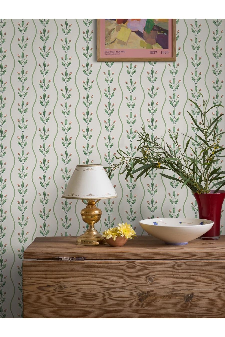 Friss, lombzöld árnyalatokkal színezve, finom piros részletekkel tarkítva, tiszta fehér háttéren, a Flower Buds tapéta könnyed, élénk energiát varázsol falaira. Elegáns csíkos mintázata virágcsokrokat és hullámvonalakat ötvöz, így a bájosságot modern stílussal egyensúlyozza. Játékos, mégis kifinomult eleganciát sugározva a Flower Buds tapéta tökéletes választás egy világos, lendületes enteriőr megalkotásához.