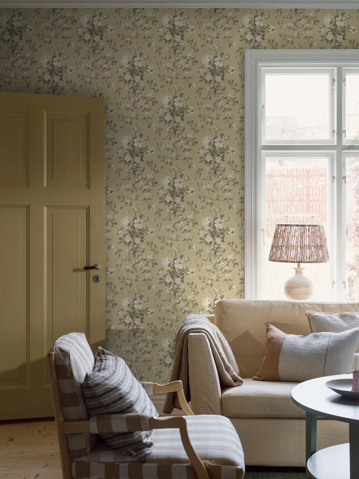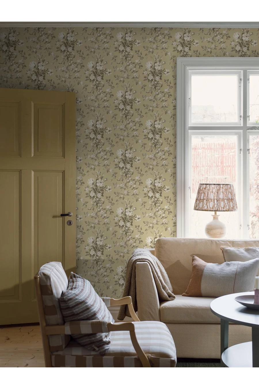Tullgarn tapétánk tompa sárgára színezett, bézs és szürkésbarna részletekkel, mely térségedbe kecses és királyi eleganciát csempész. Az eredeti tapétát Németország azon régiójából vásárolták, ahol Tullgarn kastély lakója, Viktória badeni hercegnő is élt. A feltűnő anemónák és galagonya mintázatával a Tullgarn tapéta virágos mintája lágy, napsütötte árnyalatokkal és nemes egyszerűséggel varázsolja át a teret.