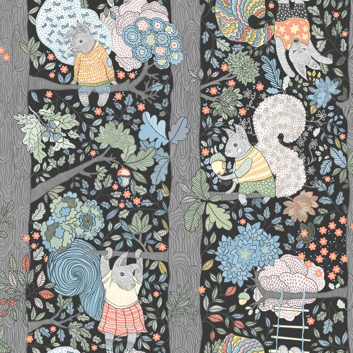 Egy kézzel rajzolt tapéta gyerekszobákba, amelyen mókusok hintáznak, fejjel lefelé lógnak és makkot gyűjtenek. A kontrasztok, részletek és élénk színek életre keltik a képzeletet ebben a történetmesélő mintában, amelyet a Boråstapeter Design Stúdiója alkotott. Itt sötét alapon, amely otthonos, játékos hangulatot teremt a gyerekszobákban.