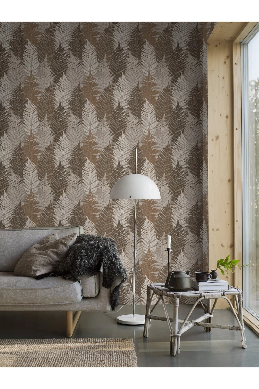 Őszi színekben, barna, fehér, bézs és rozsdás narancs árnyalatokkal, egy gitt színű háttéren, a Fern Forest tapéta élő tájat varázsol a falaira. A sűrű páfránylevelek mintázata egy buja páfrányerdőt alkot, amely távolról megtekintve halszálka mintázatot hoz létre. Ez a tapéta tökéletes választás, ha hálószobáját vagy nappaliját egy nyugalmas menedékké szeretné varázsolni.