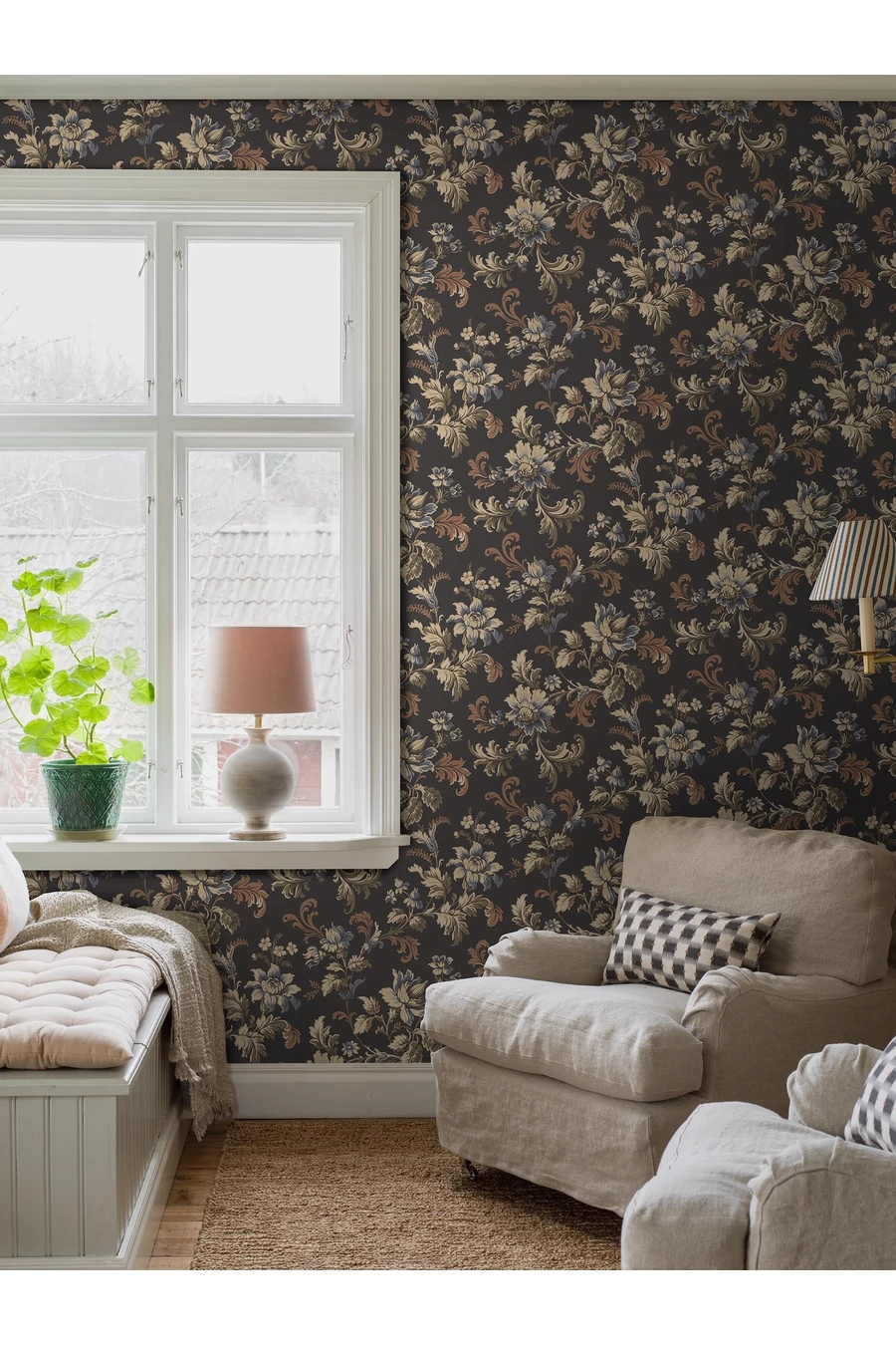 Merész fekete háttéren, olívazöld, barna és kék árnyalatú virágos indákkal díszítve az Elvira tapéta arany részleteiben ragyog. A 19. század végi eklektikus szellemiséget, az úgynevezett Reneszánsz Újjáéledést idézve, fantázia virágai valós virágokkal fonódnak össze egy pompás, lendületes, stilizált mintában. Engedd, hogy falad virágba boruljon az Elvira tapéta színházi lendületével!