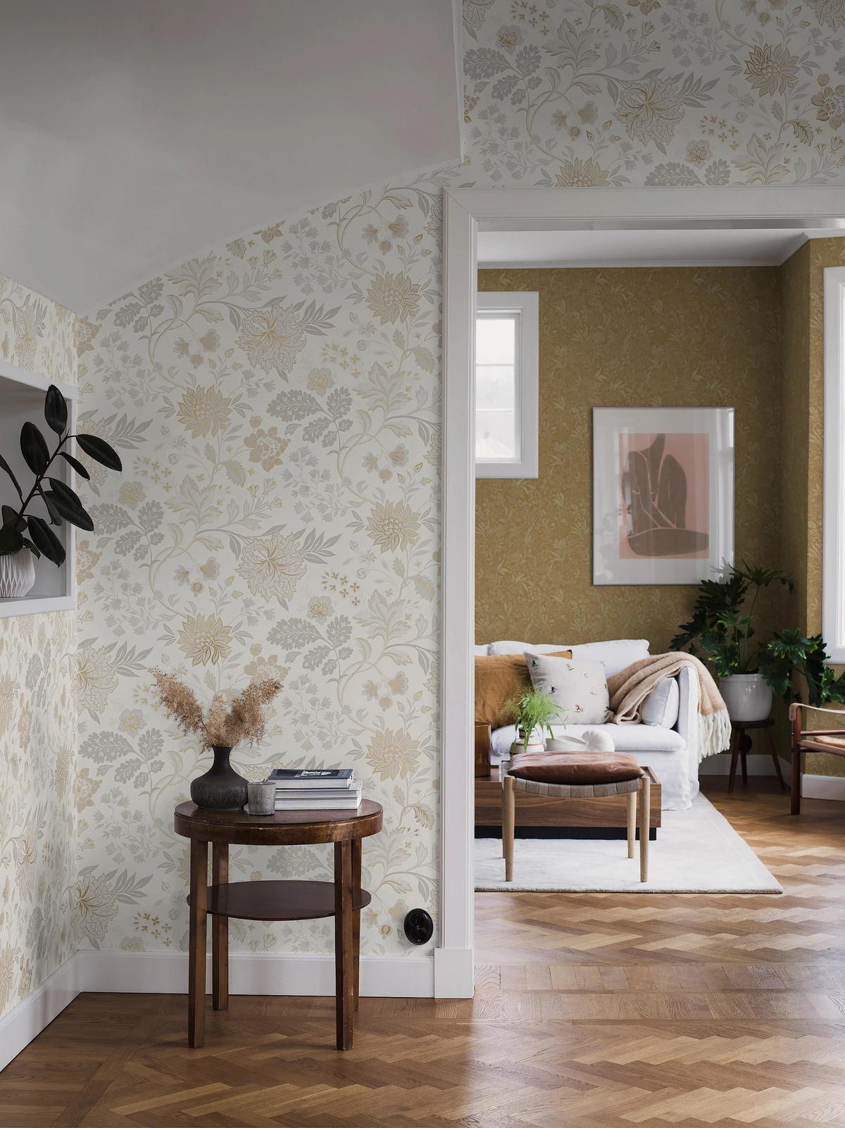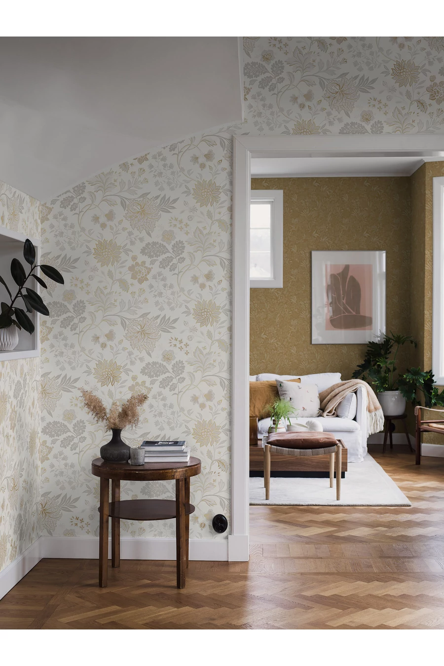 Fehér és szürke árnyalatokban, arany részletekkel színezve az Alicia tapéta könnyedén emeli a környező teret, hogy modern és vidéki hangulatot teremtsen. Friss fehér háttérrel és elbűvölő virág- és lombmintával stílust és hagyományos bájt csempész otthonába. Ragassza nappalijába, előszobájába vagy hálószobájába a luxus skandináv stílusért. Gyönyörűen mutat egy szoba mind a négy falán, vagy társítható szürke Garbo tapétánkkal.