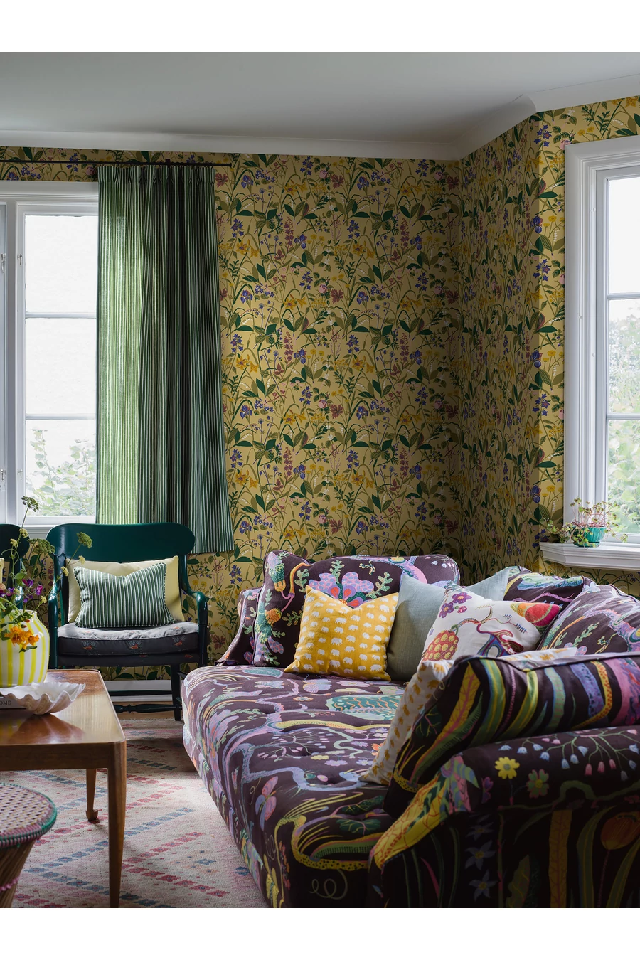 Finom, lágy sárga, zöld, fehér és kék árnyalatokban megalkotott Ros och Lilja tapétánk a klasszikus, 1940-es évekbeli svéd textiltervező, Gocken Jobs mintáit idézi meg. A svéd nyári virágok pompáját varázsolja otthonába, így egy csodálatosan nyugodt és megnyugtató légkört teremt. Ragassza hálószobájába vagy konyhájába az egyszerű elegancia jegyében.