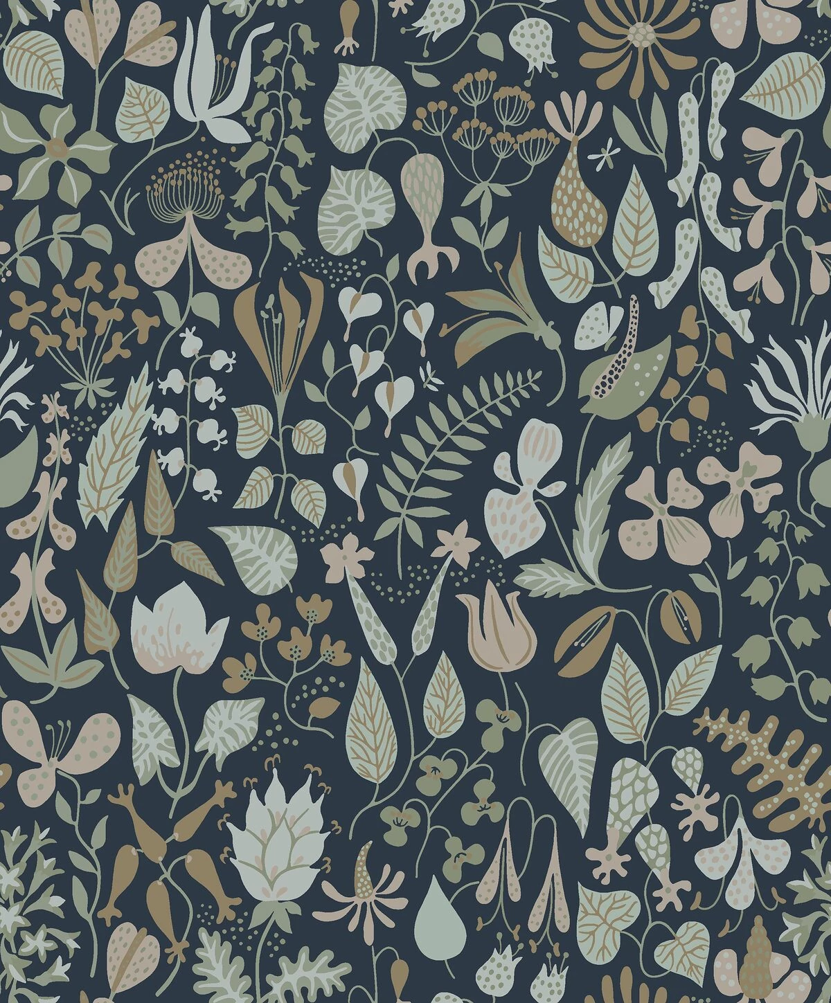 A Herbarium tapéta tompított, sokszínű virág- és levélmotívumokkal díszített, egyszínű sötétkék háttéren, amely ma is ugyanolyan jól mutat, mint az 1950-es évek közepén. A játékos és merész minta egyedi, művészi elemet visz otthonodba. Hozz egy csipetnyi skandináv stílust hálószobád, étkeződ vagy nappalid falaira ezzel a világos és részletgazdag tapétával.