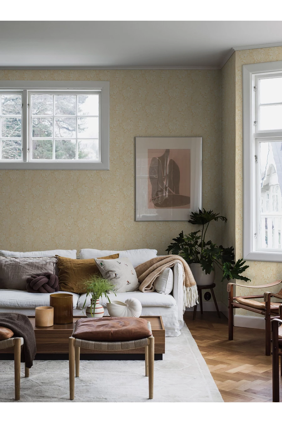 Meleg és élénk sárga árnyalatokban pompázó Acanthus tapétánk napfényes, energikus hangulatot varázsol otthonodba. A növény klasszikus eleganciáját ünnepli, amelyről a nevét kapta, botanikai mintájával, amely kígyózik és virágzik a falakon. Eredetileg az 1840-es években, fa blokknyomással készült, és az 1970-es évektől újra népszerűvé vált, ma ugyanolyan kortárs, mint akkor. Ragaszd a hálószobádba, étkeződbe vagy irodádba egy kifinomult skandináv stílusért.