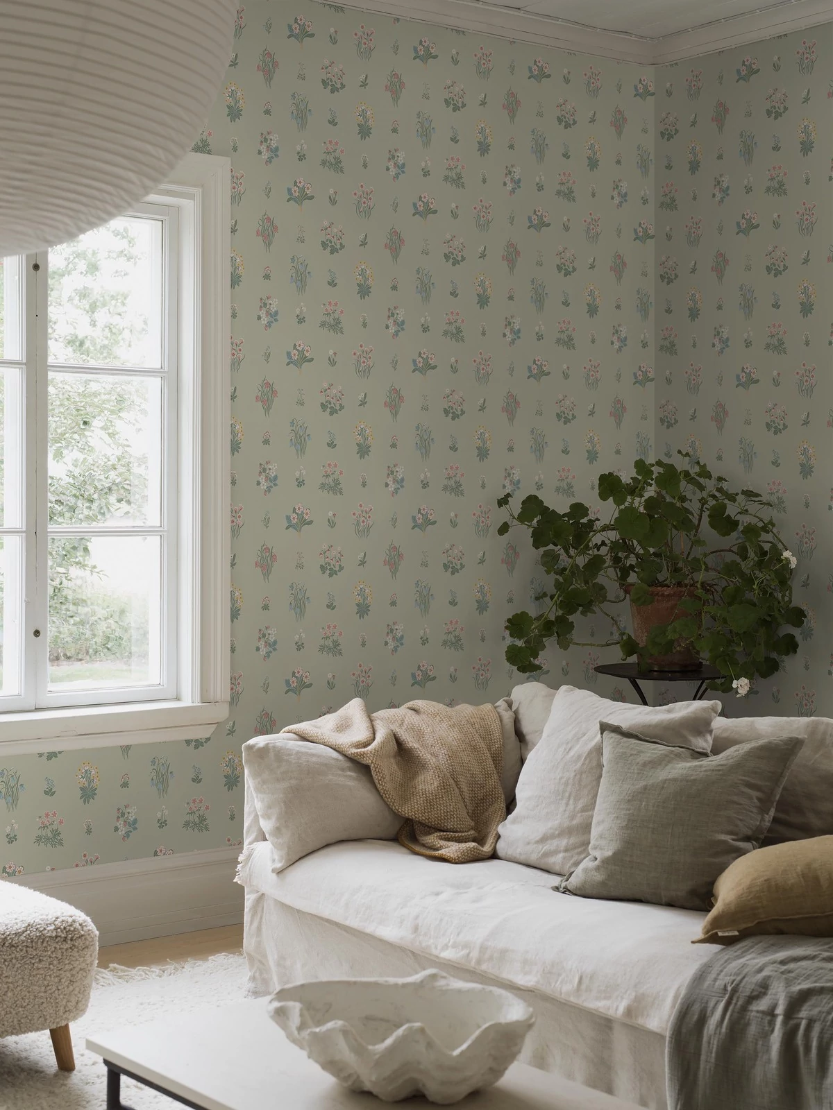 Az Ängsflora könnyed és finom, sokszínű virágmotívumaival emeli a helyiségek hangulatát. A világos hársfa zöld alapon apró, kézzel festett virágok nyújtanak nyugodt, mégis színes megjelenést, amely könnyen harmonizál otthona többi részletével. Ez az elegáns tapéta, melyet Noomi Spange tervezett, gyönyörű hátteret biztosít hálószobák, étkezők és konyhák számára.