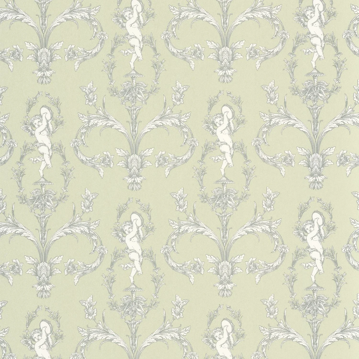 Angyalka-kórus. A bájos Séraphin repkedő puttókat ábrázol virágos arabeszkek hátterében. Az eredmény egyszerre dinamikus és finoman részletezett minta – igazi kis mestermű.