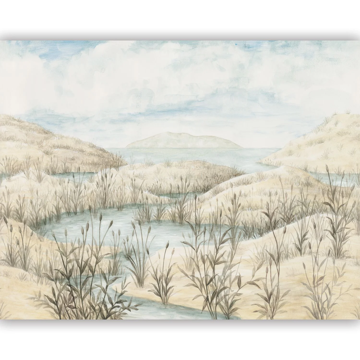 Bájos sósmocsarak, egy csábító, sós tengeri kis zug: Chemin Cotier. A nádak lágyan meghajolnak az ideiglenes csatorna mentén, bárányfelhős égbolt alatt. A vad természet itt megnyugszik. Ehhez a panorámatájképhez 3 standard méret közül választhatsz, a méretek pedig igény szerint személyre szabhatók.