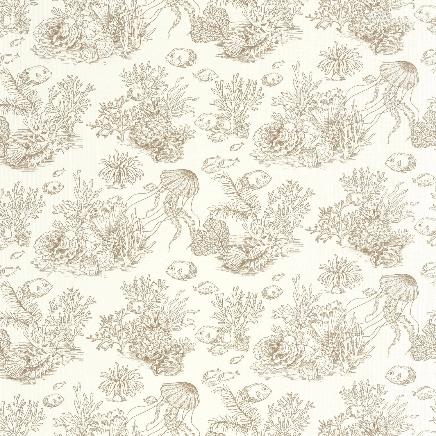 Egy kicsit formabontó: a Côte sauvage a toile de Jouy textíliákat tengerfenék-témára ülteti át – természetesen tapétán. A rusztikus jelenetek helyét itt is egy korallzátony szíve veszi át, tele egzotikus halakkal.