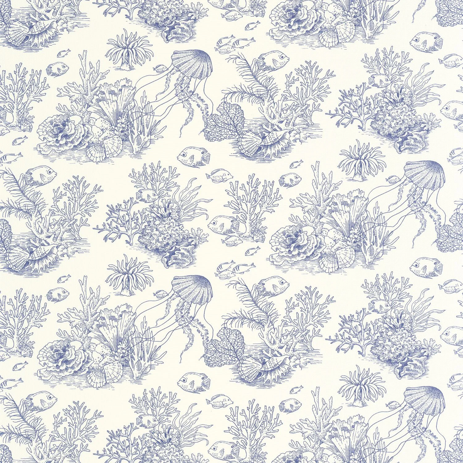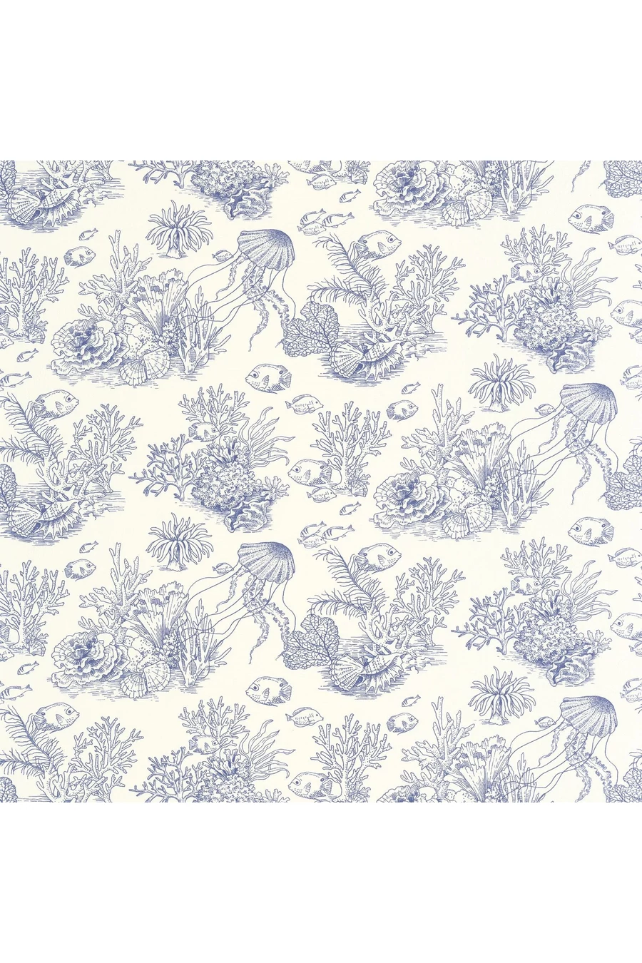 Egy kicsit formabontó: a Côte sauvage a toile de Jouy textíliákat tengerfenék-témára ülteti át – természetesen tapétán. A rusztikus jelenetek helyét itt is egy korallzátony szíve veszi át, tele egzotikus halakkal.