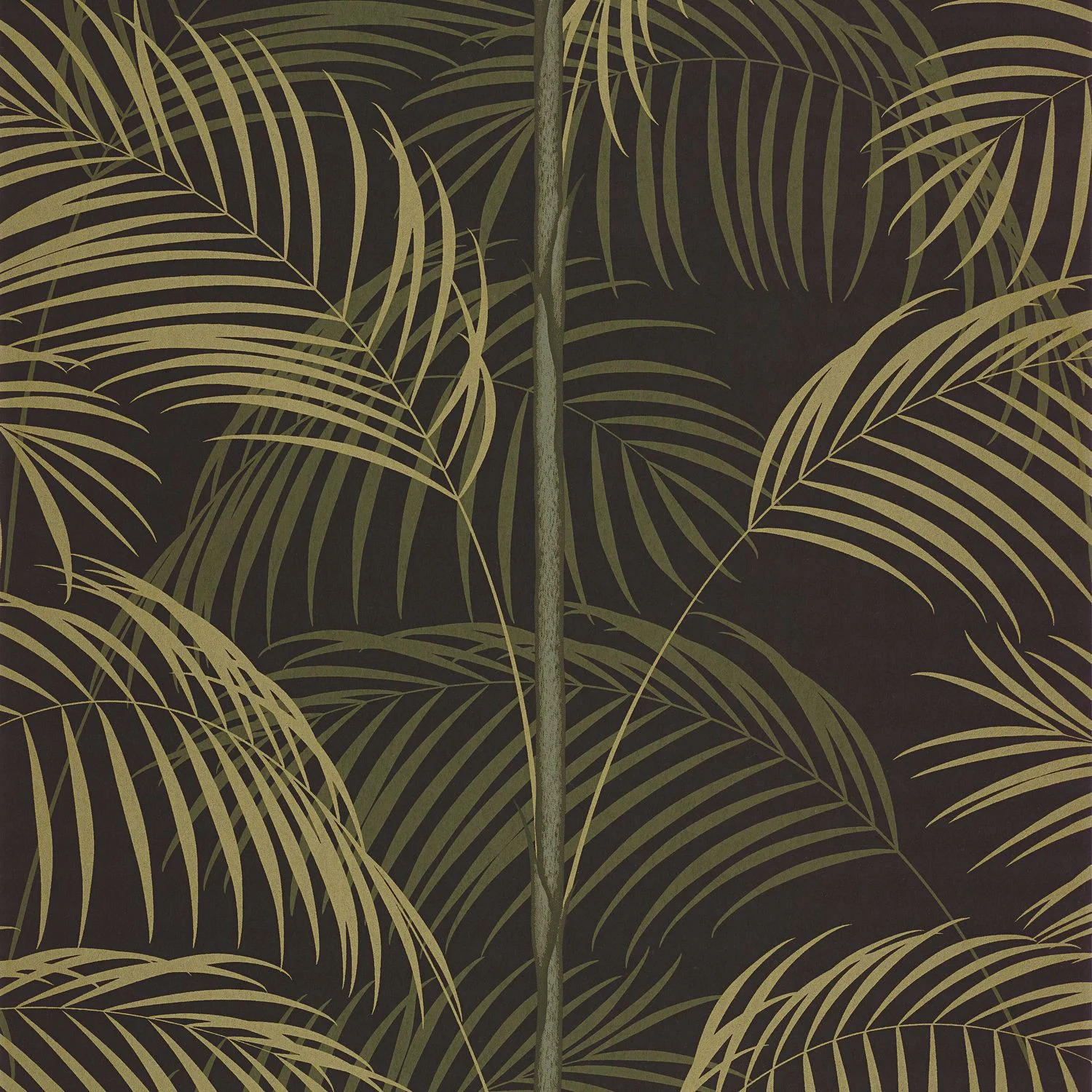 Arany pálmák alatt. A Le Tout-Paris finoman elegáns mintája XL méretű pálmaleveleket ölel körbe arany- vagy ezüstfényű részletekkel. Természetes, organikus karakterét finom zöld árnyalatok emelik ki: olíva, khaki és lombzöld.