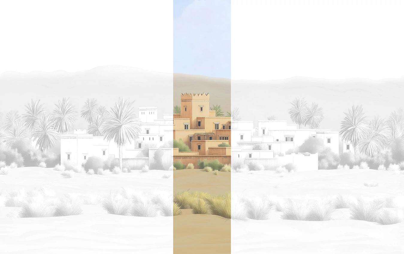 A JV 202 Murals Decor kollekció széles választékát kínálja dekoratív falfestményeknek, amelyekkel egyedi hangulatot és személyre szabott stílust varázsolhatunk a térbe. Egy új témákkal teli ajánlat, amely egy lebontási rendszert alkalmaz, ami a kollekció sarokköve a könnyű választás és alkalmazás érdekében. Egy arab város bontakozik ki a távolban a sivatag csendjében, homokdűnék, bokrok és pálmafák között; a kék változat egyértelmű utalás Chefchaouenre, a marokkói jellegzetes „kék városra”. A Todra árnyalatai, melyeket dombornyomás támogat, meleget és karaktert kölcsönöznek a tereknek, és újraalkotják a homok textúráját.