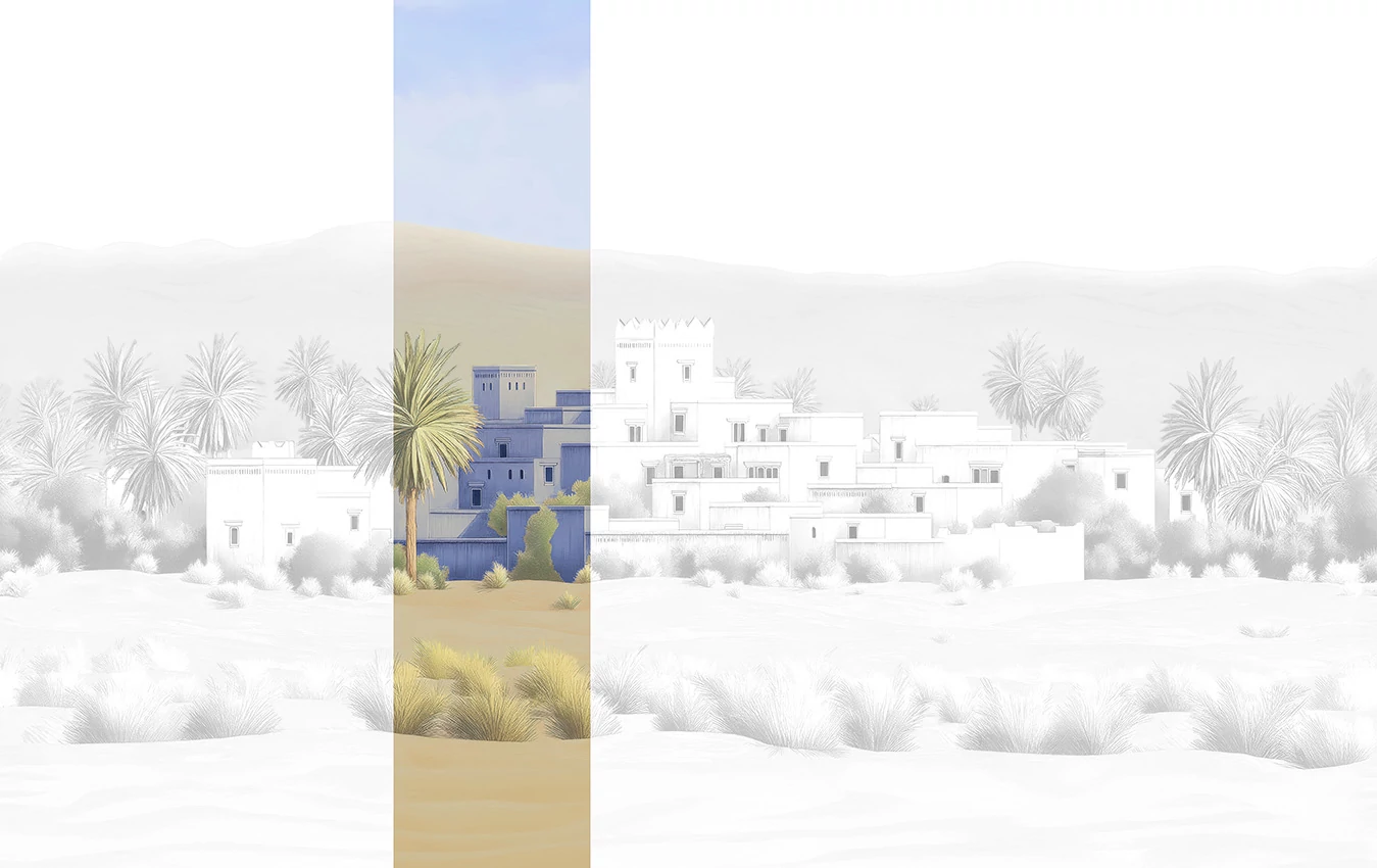 A JV 202 Murals Decor kollekció széles választékát kínálja dekoratív falfestményeknek, amelyekkel egyedi hangulatot és személyre szabott stílust varázsolhatunk a térbe. Egy új témákkal teli ajánlat, amely egy lebontási rendszert alkalmaz, ami a kollekció sarokköve a könnyű választás és alkalmazás érdekében. Egy arab város bontakozik ki a távolban a sivatag csendjében, homokdűnék, bokrok és pálmafák között; a kék változat egyértelmű utalás Chefchaouenre, a marokkói jellegzetes „kék városra”. A Todra árnyalatai, melyeket dombornyomás támogat, meleget és karaktert kölcsönöznek a tereknek, és újraalkotják a homok textúráját.