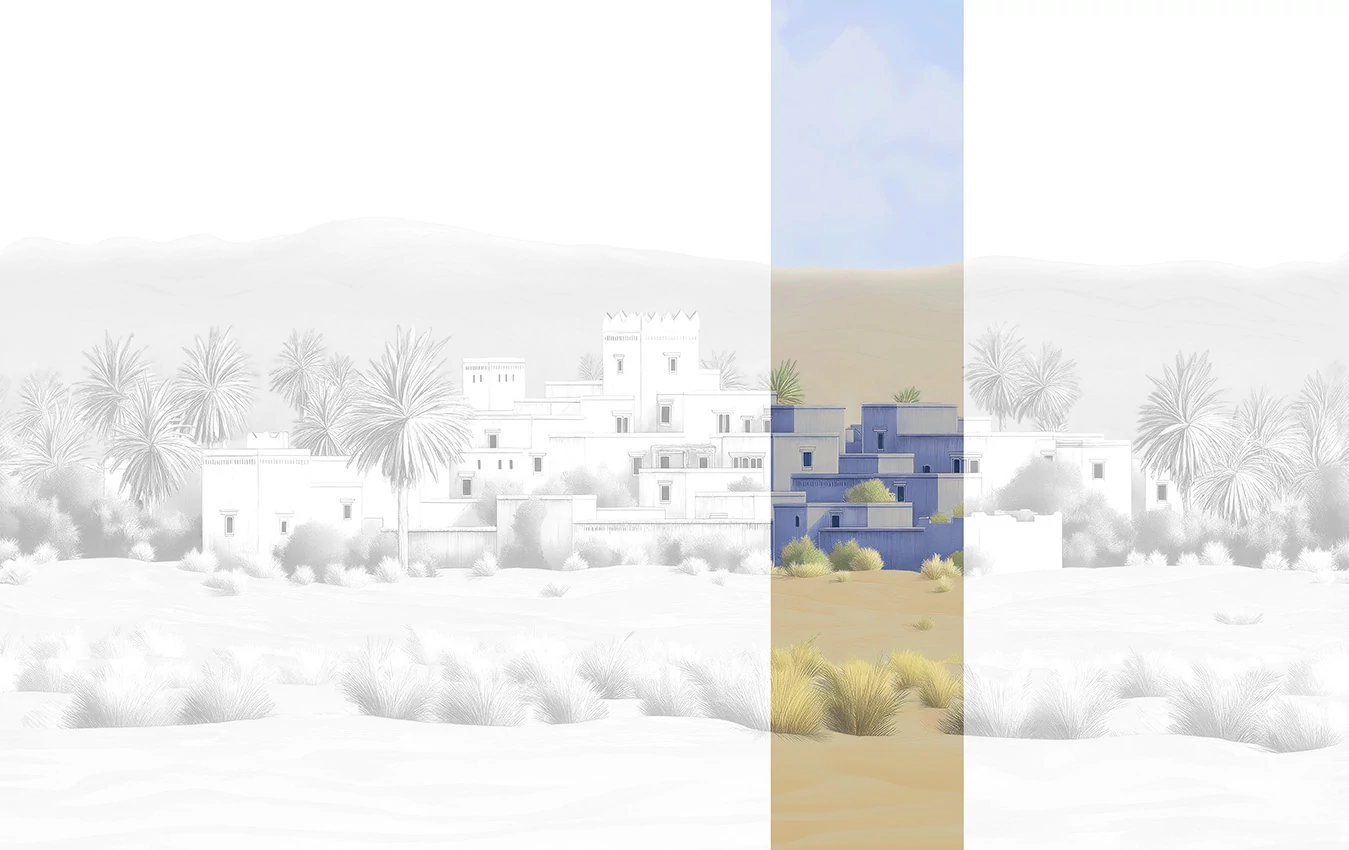 A JV 202 Murals Decor kollekció széles választékát kínálja dekoratív falfestményeknek, amelyekkel egyedi hangulatot és személyre szabott stílust varázsolhatunk a térbe. Egy új témákkal teli ajánlat, amely egy lebontási rendszert alkalmaz, ami a kollekció sarokköve a könnyű választás és alkalmazás érdekében. Egy arab város bontakozik ki a távolban a sivatag csendjében, homokdűnék, bokrok és pálmafák között; a kék változat egyértelmű utalás Chefchaouenre, a marokkói jellegzetes „kék városra”. A Todra árnyalatai, melyeket dombornyomás támogat, meleget és karaktert kölcsönöznek a tereknek, és újraalkotják a homok textúráját.