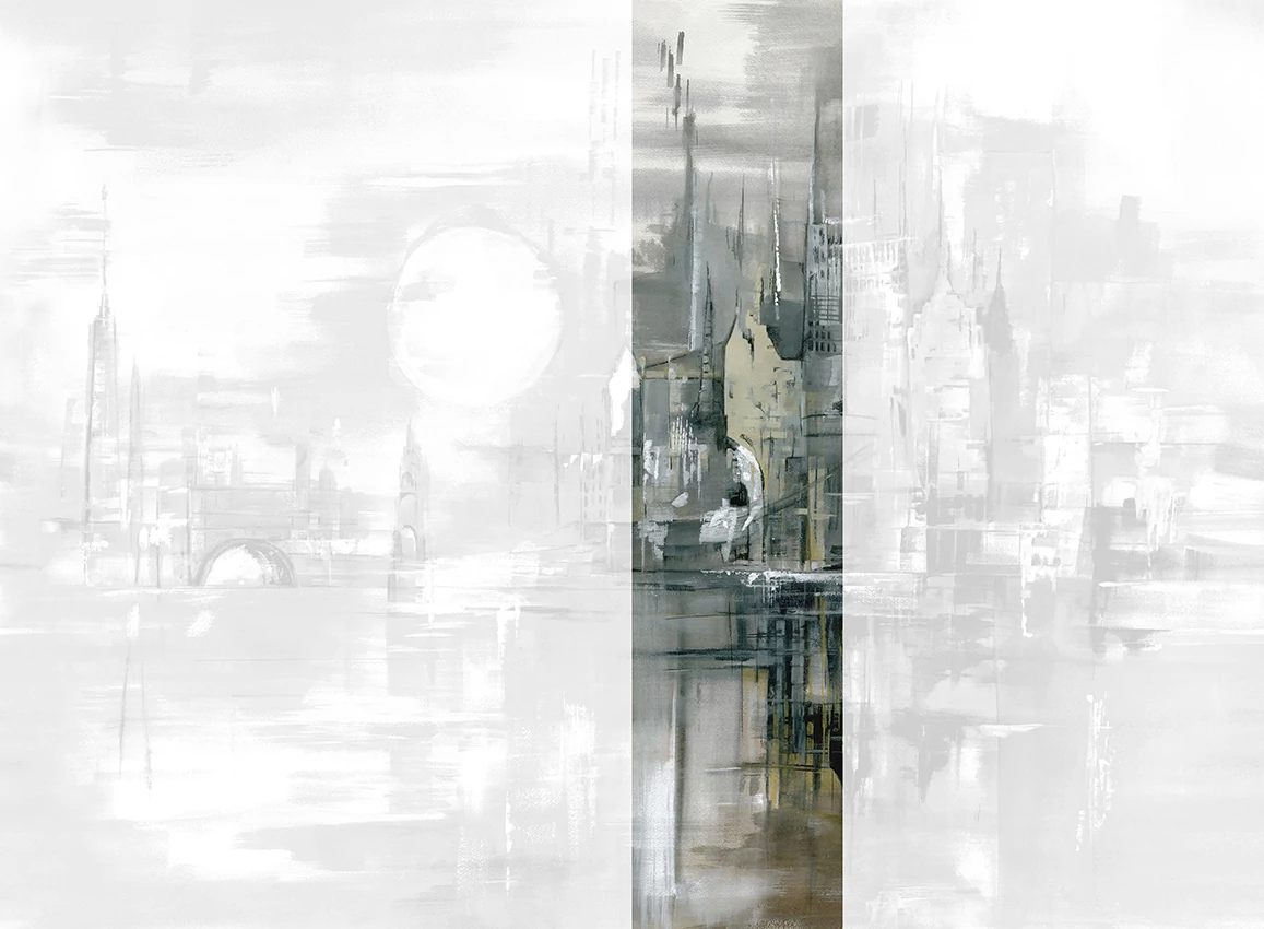 A JV 202 Murals Decor kollekció széles választékát kínálja dekoratív falfestményeknek, amelyekkel egyedi hangulatot és személyre szabott stílust varázsolhatunk a térbe. Egy olyan új témákkal teli ajánlat, amely egy lebontási rendszert alkalmaz, ami a kollekció sarokköve a könnyű választás és alkalmazás érdekében. Egy város, amelyet a hold fénye világít meg, visszatükröződve a folyón, amely átszeli, fény- és árnyjátékban. A dombornyomás kiemeli a minta perspektíváját és teret ad a környezetnek; az ezüst alapú változatban a fémes hatás körvonalazza a holdat, kiemelve azt, így fénypontot teremtve a helyiségben.