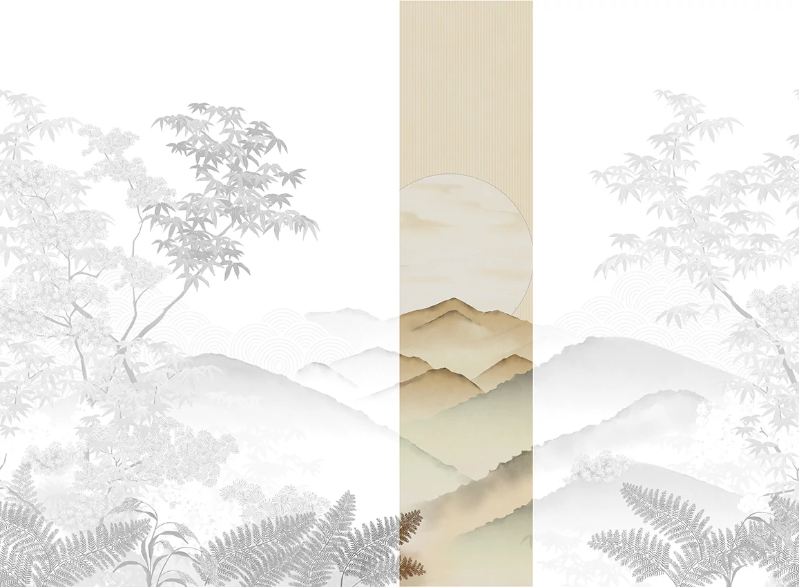 A JV 202 Murals Decor kollekció széles választékát kínálja dekoratív falfestményeknek, amelyekkel egyedi hangulatot és személyre szabott stílust varázsolhatunk a térbe. Egy olyan újdonságokkal teli ajánlat, amely egy lebontási rendszert alkalmaz, ami a kollekció sarokköve a könnyű választás és alkalmazás érdekében. Egy dombok közé ékelt tájkép, ahol a főszereplő a nap, amely éppen lenyugszik, és az utolsó fényeket adja a völgynek. Invermere, amelyet egy kerek, geometrikus motívum gazdagít, amely a dombok mögül emelkedik ki, mélységet és dinamizmust kölcsönözve, egyértelmű utalásként a japán kertekre.