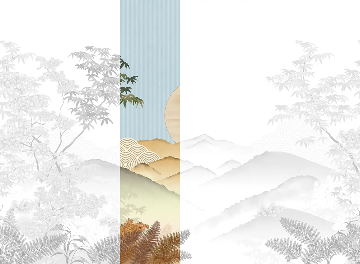 A JV 202 Murals Decor kollekció széles választékát kínálja dekoratív falfestményeknek, amelyekkel egyedi hangulatot és személyre szabott stílust varázsolhatunk a térbe. Egy olyan újdonságokkal teli ajánlat, amely egy lebontási rendszert alkalmaz, ami a kollekció sarokköve a könnyű választás és alkalmazás érdekében. Egy dombok közé ékelt tájkép, ahol a főszereplő a nap, amely éppen lenyugszik, és az utolsó fényeket adja a völgynek. Invermere, amelyet egy kerek, geometrikus motívum gazdagít, amely a dombok mögül emelkedik ki, mélységet és dinamizmust kölcsönözve, egyértelmű utalásként a japán kertekre.