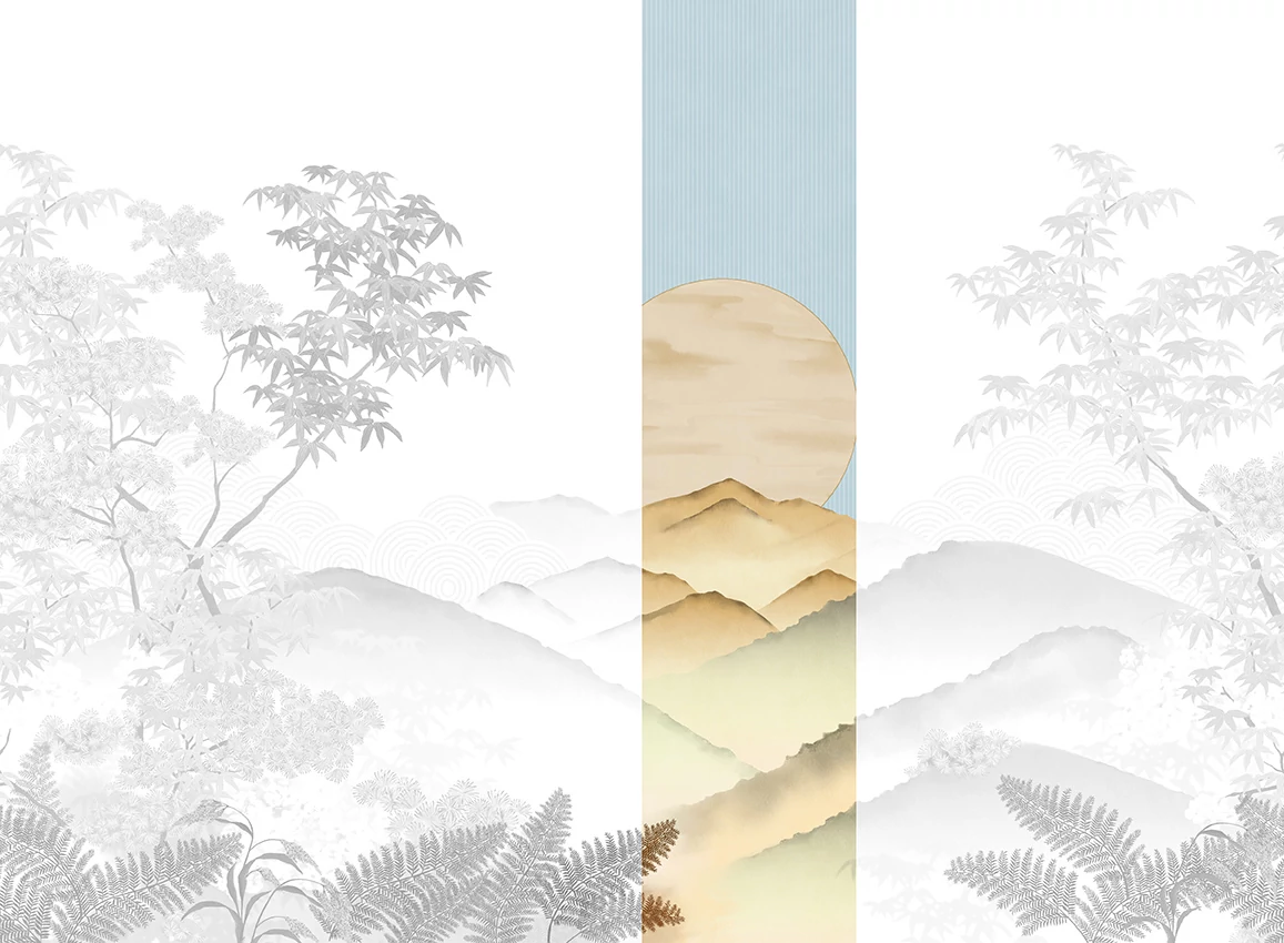 A JV 202 Murals Decor kollekció széles választékát kínálja dekoratív falfestményeknek, amelyekkel egyedi hangulatot és személyre szabott stílust varázsolhatunk a térbe. Egy olyan újdonságokkal teli ajánlat, amely egy lebontási rendszert alkalmaz, ami a kollekció sarokköve a könnyű választás és alkalmazás érdekében. Egy dombok közé ékelt tájkép, ahol a főszereplő a nap, amely éppen lenyugszik, és az utolsó fényeket adja a völgynek. Invermere, amelyet egy kerek, geometrikus motívum gazdagít, amely a dombok mögül emelkedik ki, mélységet és dinamizmust kölcsönözve, egyértelmű utalásként a japán kertekre.