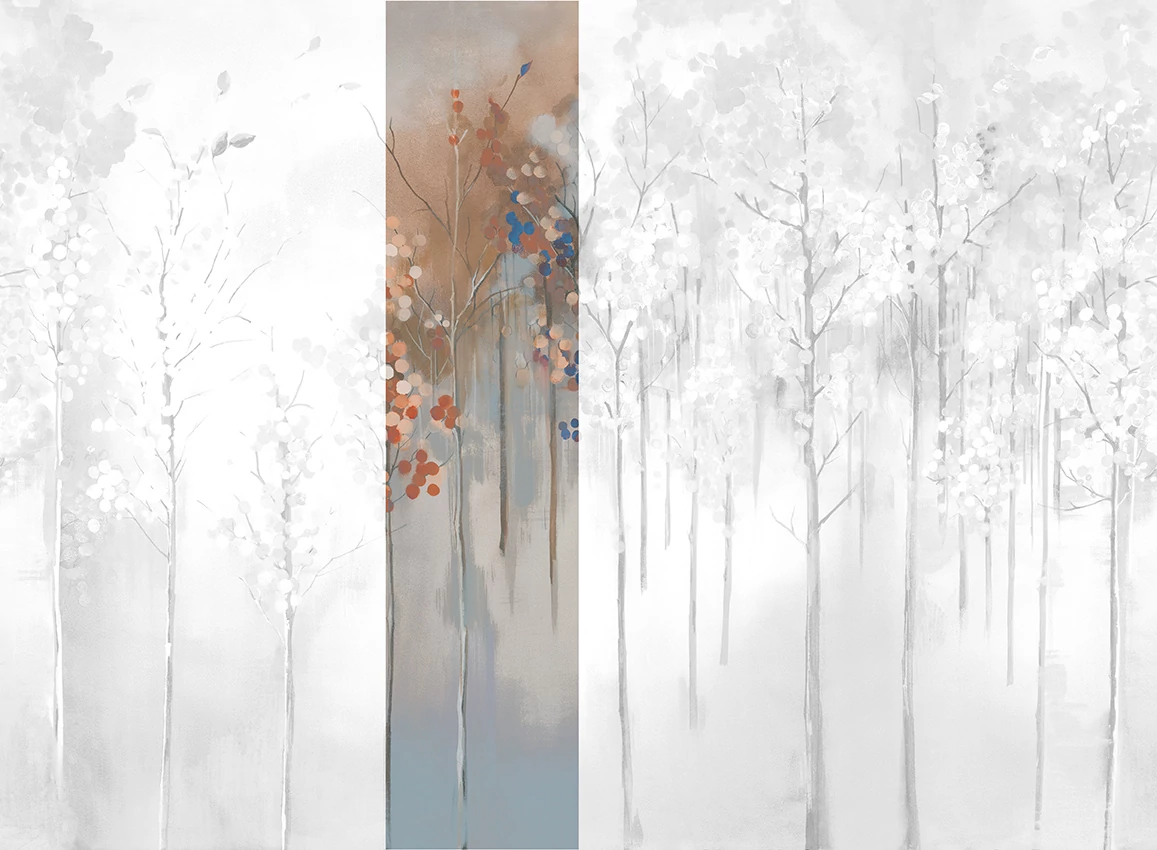 A JV 202 Murals Decor kollekció széles választékát kínálja dekoratív falfestményeknek, amelyekkel egyedi hangulatot és személyre szabott stílust varázsolhat otthonába. Az új témákban gazdag kínálat egy lebontási rendszert alkalmaz, amely a kollekció alapköve, megkönnyítve a választást és a felhelyezést. Elvarázsolt erdő, ködbe burkolózva, nyírfákat ábrázolva őszi lombkoronával. Juharfa minták különböző színvariációkban, amelyek melegséget sugároznak a helyiségekbe, és az ezüst alapon világító változatban megvilágítják a falat.
