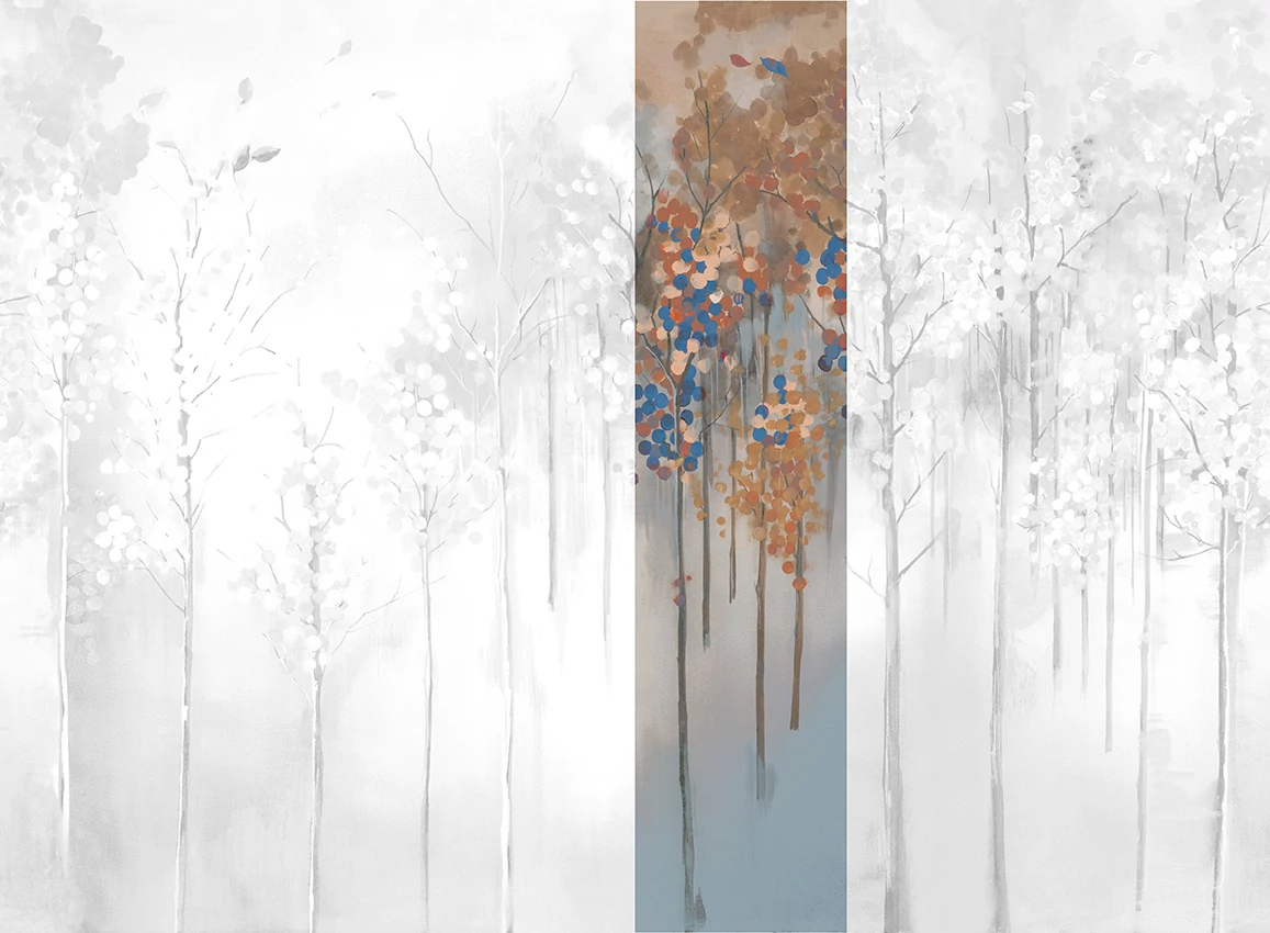 A JV 202 Murals Decor kollekció széles választékát kínálja dekoratív falfestményeknek, amelyekkel egyedi hangulatot és személyre szabott stílust varázsolhat otthonába. Az új témákban gazdag kínálat egy lebontási rendszert alkalmaz, amely a kollekció alapköve, megkönnyítve a választást és a felhelyezést. Elvarázsolt erdő, ködbe burkolózva, nyírfákat ábrázolva őszi lombkoronával. Juharfa minták különböző színvariációkban, amelyek melegséget sugároznak a helyiségekbe, és az ezüst alapon világító változatban megvilágítják a falat.