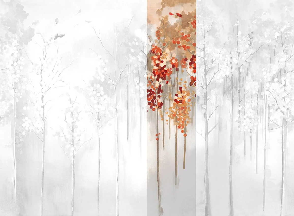 A JV 202 Murals Decor kollekció széles választékát kínálja dekoratív falfestményeknek, amelyekkel egyedi hangulatot és személyre szabott stílust varázsolhat otthonába. Az új témákban gazdag kínálat egy lebontási rendszert alkalmaz, amely a kollekció alapköve, megkönnyítve a választást és a felhelyezést. Elvarázsolt erdő, ködbe burkolózva, nyírfákat ábrázolva őszi lombkoronával. Juharfa minták különböző színvariációkban, amelyek melegséget sugároznak a helyiségekbe, és az ezüst alapon világító változatban megvilágítják a falat.