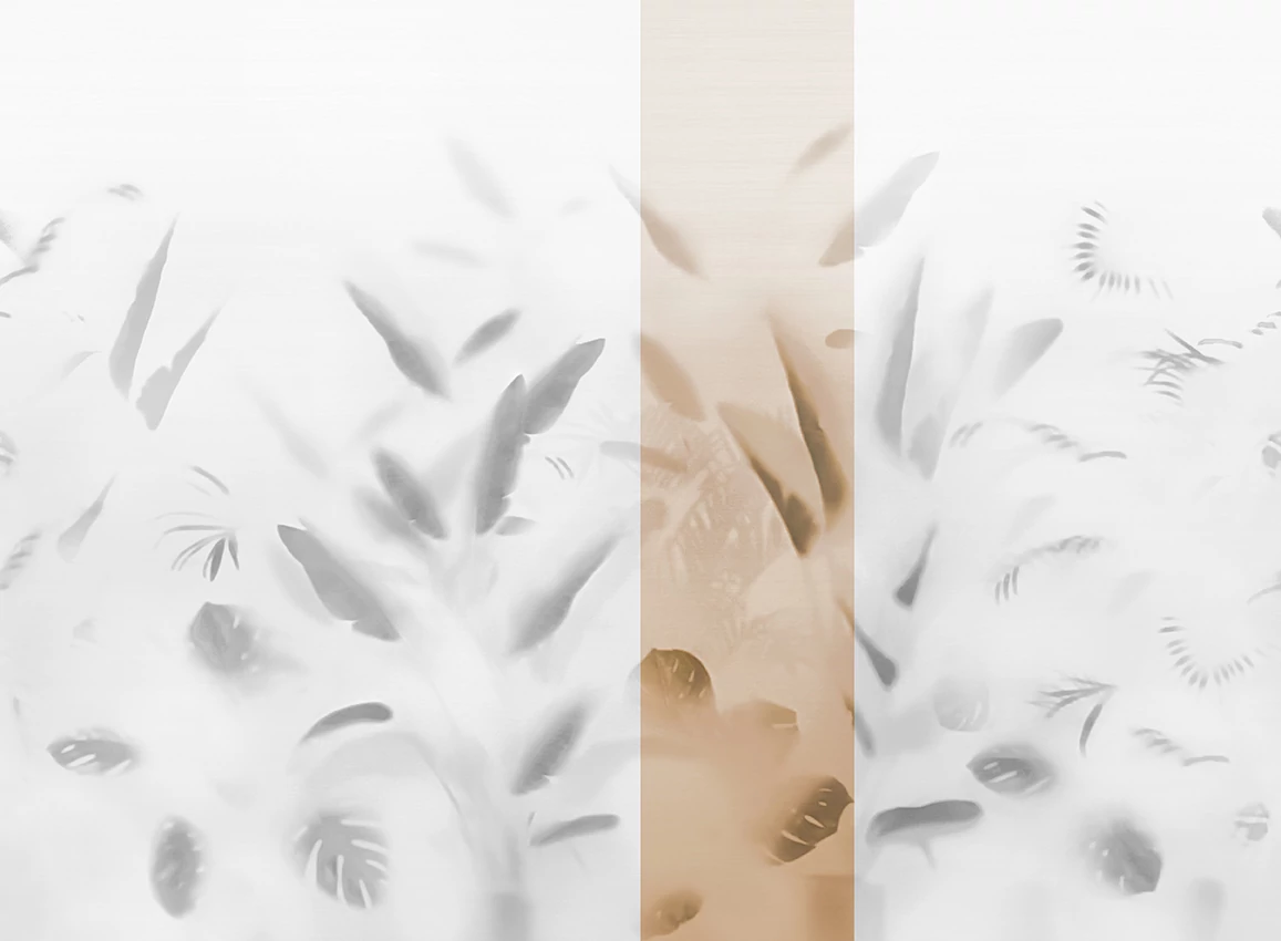 A JV 202 Murals Decor kollekció széles választékát kínálja dekoratív falfestményeknek, amelyekkel egyedi hangulatot és személyre szabott stílust varázsolhat otthonába vagy bármilyen térbe. Az új témákkal teli kínálat egy lebontási rendszert alkalmaz, amely a kollekció sarokköve, megkönnyítve a választást és az alkalmazást. Egy matt üveg, amelyen keresztül a trópusi levelek sziluettjei sejlenek fel. A Nadi bármilyen környezethez alkalmazkodik, legyen az magánlakás vagy szerződéses tér, tökéletes hátteret teremtve a berendezésnek.