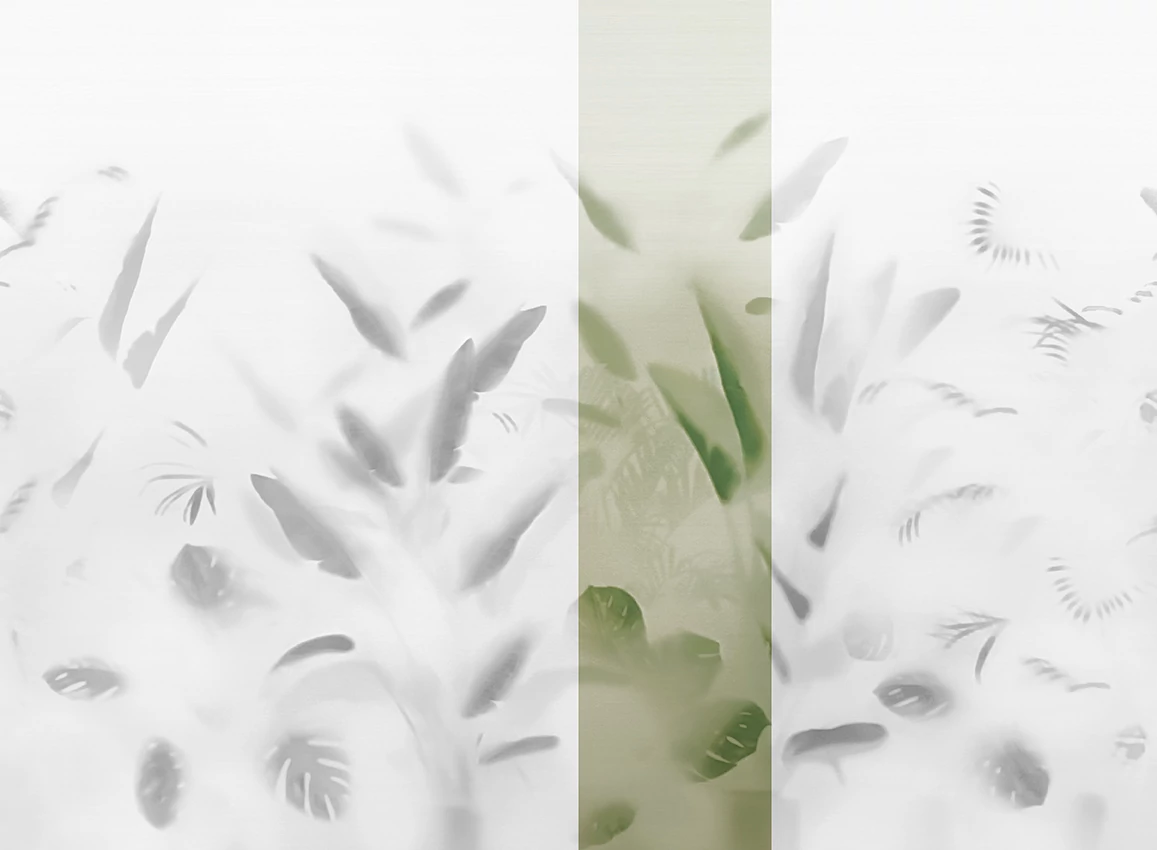 A JV 202 Murals Decor kollekció széles választékát kínálja dekoratív falfestményeknek, amelyekkel egyedi hangulatot és személyre szabott stílust varázsolhat otthonába vagy bármilyen térbe. Az új témákkal teli kínálat egy lebontási rendszert alkalmaz, amely a kollekció sarokköve, megkönnyítve a választást és az alkalmazást. Egy matt üveg, amelyen keresztül a trópusi levelek sziluettjei sejlenek fel. A Nadi bármilyen környezethez alkalmazkodik, legyen az magánlakás vagy szerződéses tér, tökéletes hátteret teremtve a berendezésnek.