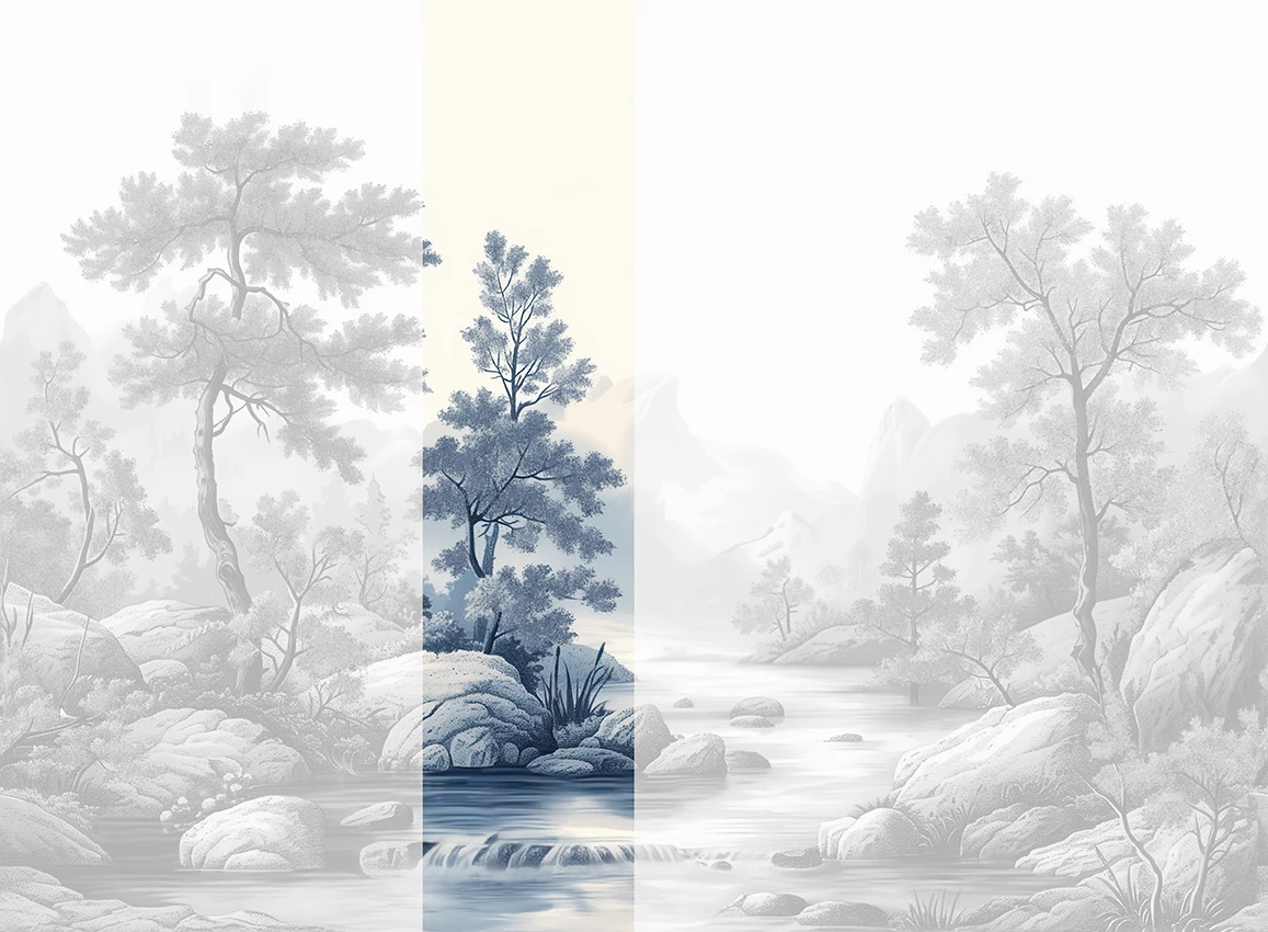 A JV 202 Murals Decor kollekció széles választékot kínál dekoratív falfestményekből, amelyekkel egyedi hangulatot és személyre szabott stílust varázsolhatunk a térbe. Egy olyan kínálat, amely tele van új motívumokkal, és egy lebontási rendszerre épül, amely a kollekció sarokköve, megkönnyítve a választást és az alkalmazást. Egy patakkal átszelt erdő, amelyet hegyek vesznek körül: egy idilli táj, amely nyugalmat és békét sugároz, ideális mind szerződéses, mind magánterületekre. Az Arcadia, a folyó víz és a távolban felbukkanó hegyek révén, mozgást és mélységet kölcsönöz a helyiségeknek.