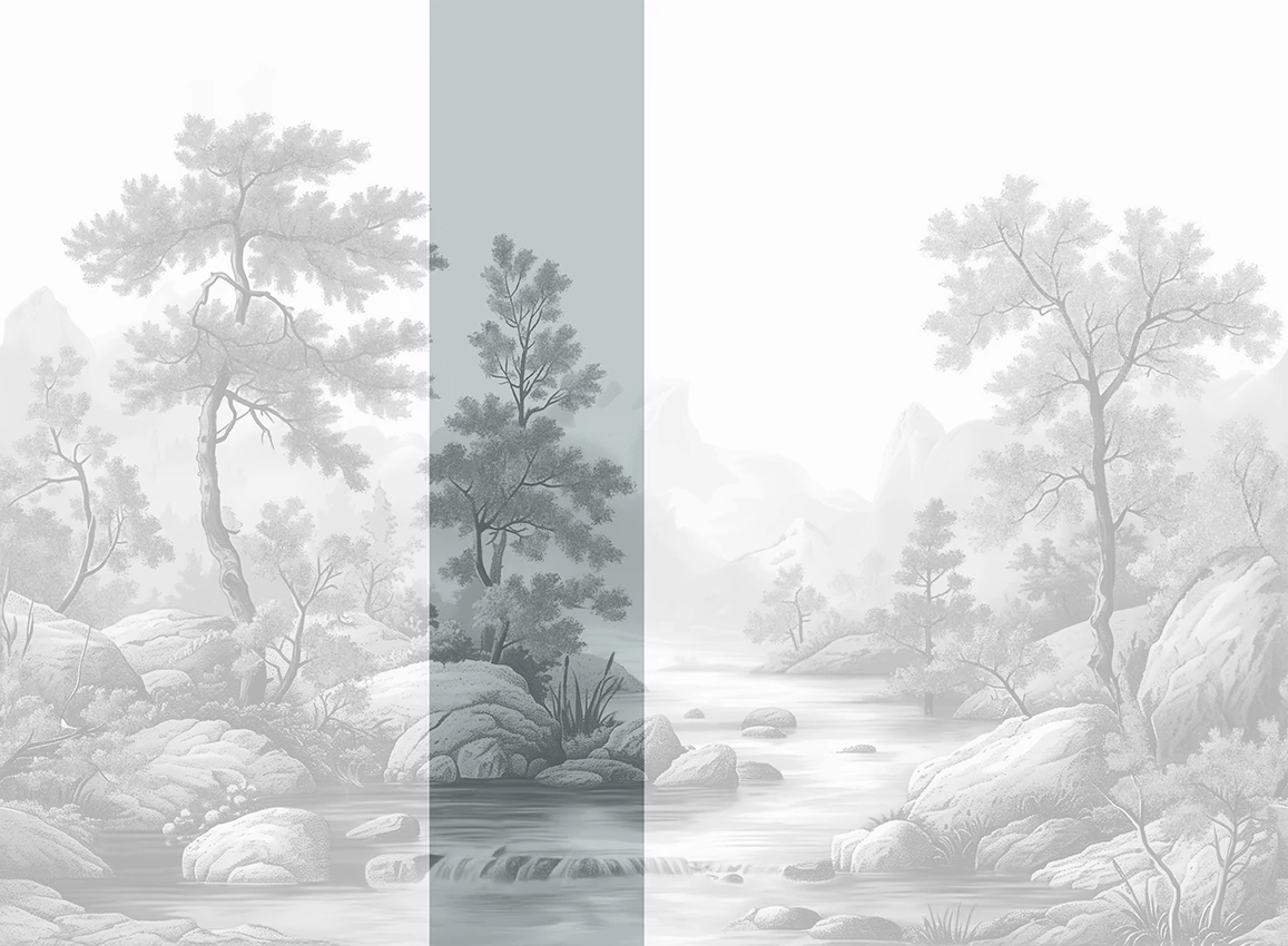 A JV 202 Murals Decor kollekció széles választékot kínál dekoratív falfestményekből, amelyekkel egyedi hangulatot és személyre szabott stílust varázsolhatunk a térbe. Egy olyan kínálat, amely tele van új motívumokkal, és egy lebontási rendszerre épül, amely a kollekció sarokköve, megkönnyítve a választást és az alkalmazást. Egy patakkal átszelt erdő, amelyet hegyek vesznek körül: egy idilli táj, amely nyugalmat és békét sugároz, ideális mind szerződéses, mind magánterületekre. Az Arcadia, a folyó víz és a távolban felbukkanó hegyek révén, mozgást és mélységet kölcsönöz a helyiségeknek.