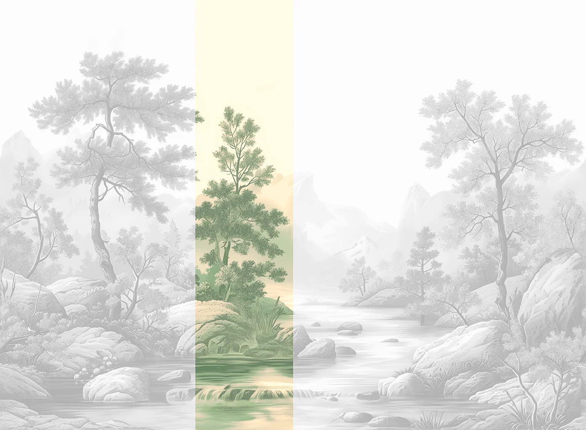 A JV 202 Murals Decor kollekció széles választékot kínál dekoratív falfestményekből, amelyekkel egyedi hangulatot és személyre szabott stílust varázsolhatunk a térbe. Egy olyan kínálat, amely tele van új motívumokkal, és egy lebontási rendszerre épül, amely a kollekció sarokköve, megkönnyítve a választást és az alkalmazást. Egy patakkal átszelt erdő, amelyet hegyek vesznek körül: egy idilli táj, amely nyugalmat és békét sugároz, ideális mind szerződéses, mind magánterületekre. Az Arcadia, a folyó víz és a távolban felbukkanó hegyek révén, mozgást és mélységet kölcsönöz a helyiségeknek.