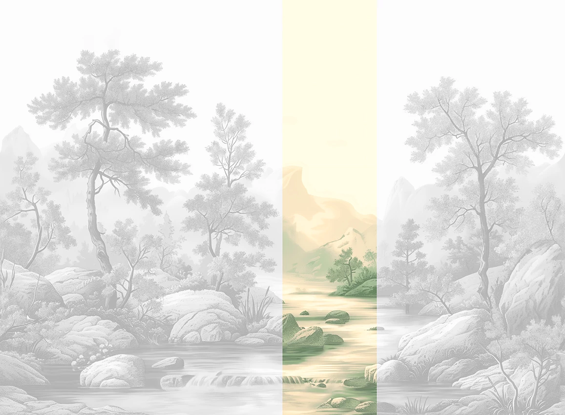 A JV 202 Murals Decor kollekció széles választékot kínál dekoratív falfestményekből, amelyekkel egyedi hangulatot és személyre szabott stílust varázsolhatunk a térbe. Egy olyan kínálat, amely tele van új motívumokkal, és egy lebontási rendszerre épül, amely a kollekció sarokköve, megkönnyítve a választást és az alkalmazást. Egy patakkal átszelt erdő, amelyet hegyek vesznek körül: egy idilli táj, amely nyugalmat és békét sugároz, ideális mind szerződéses, mind magánterületekre. Az Arcadia, a folyó víz és a távolban felbukkanó hegyek révén, mozgást és mélységet kölcsönöz a helyiségeknek.