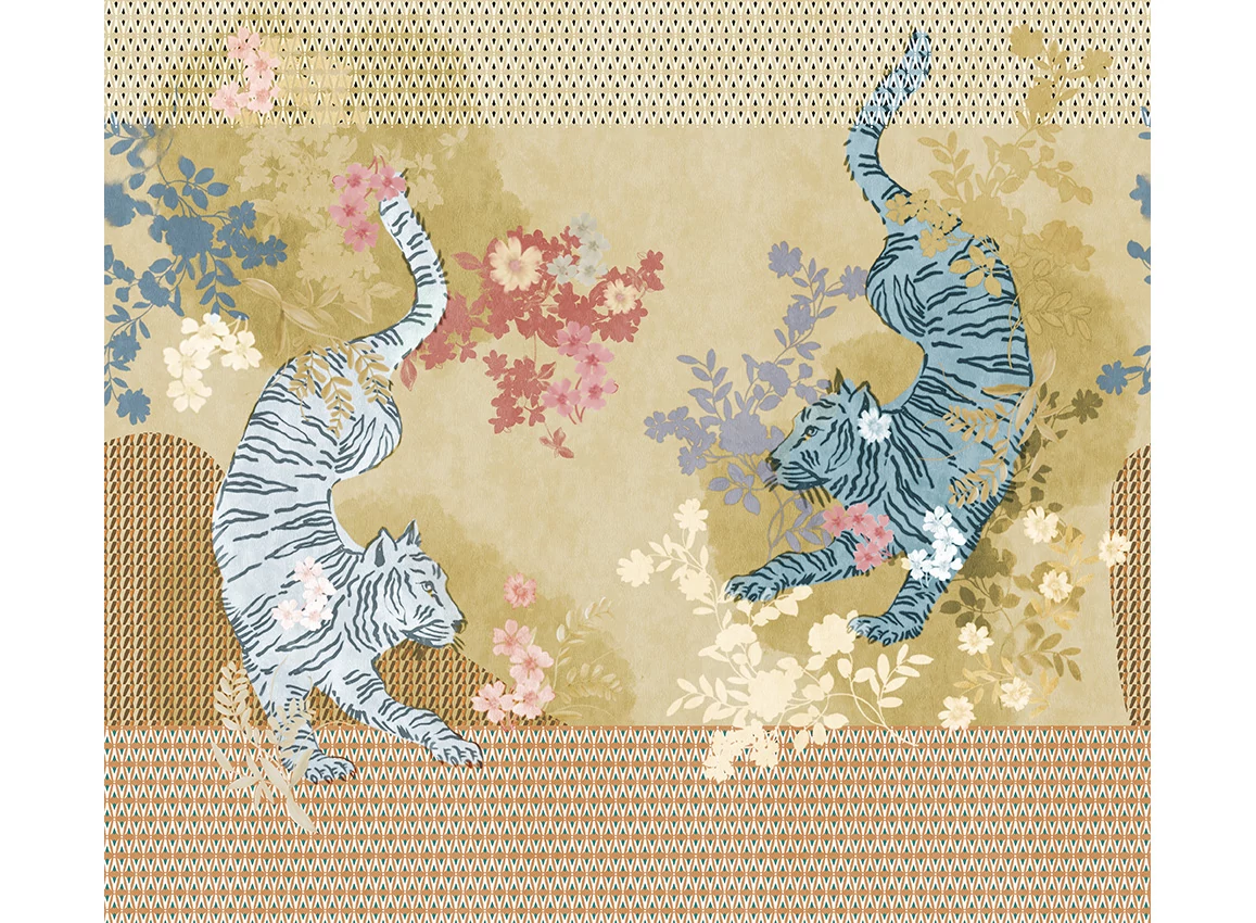 A JV 202 Murals Decor kollekció széles választékát kínálja dekoratív falfestményeknek, amelyekkel egyedi hangulatot és személyre szabott stílust varázsolhat otthonába. Az új témákkal teli kínálat egy lebontási rendszert alkalmaz, amely a kollekció sarokköve a könnyű választás és alkalmazás érdekében. Két tigris méltóságteljesen táncol egy virágos kertben, amelyet egy geometrikus minta keretez, kiemelve a dizájnt. A világos fémes hatás, amely néhány változatban megjelenik, ezüst alapjának köszönhetően dinamizmust és mozgást kölcsönöz.