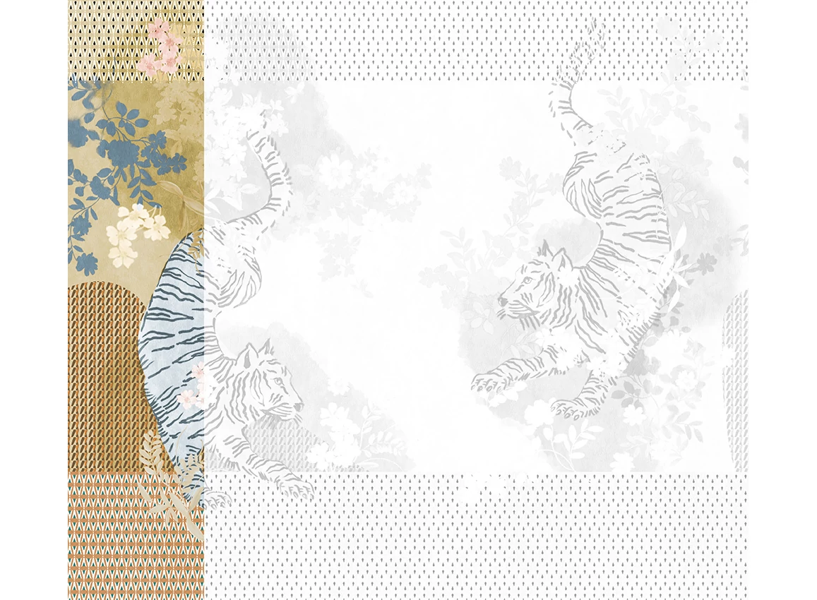 A JV 202 Murals Decor kollekció széles választékát kínálja dekoratív falfestményeknek, amelyekkel egyedi hangulatot és személyre szabott stílust varázsolhat otthonába. Az új témákkal teli kínálat egy lebontási rendszert alkalmaz, amely a kollekció sarokköve a könnyű választás és alkalmazás érdekében. Két tigris méltóságteljesen táncol egy virágos kertben, amelyet egy geometrikus minta keretez, kiemelve a dizájnt. A világos fémes hatás, amely néhány változatban megjelenik, ezüst alapjának köszönhetően dinamizmust és mozgást kölcsönöz.