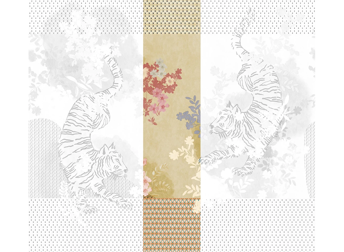 A JV 202 Murals Decor kollekció széles választékát kínálja dekoratív falfestményeknek, amelyekkel egyedi hangulatot és személyre szabott stílust varázsolhat otthonába. Az új témákkal teli kínálat egy lebontási rendszert alkalmaz, amely a kollekció sarokköve a könnyű választás és alkalmazás érdekében. Két tigris méltóságteljesen táncol egy virágos kertben, amelyet egy geometrikus minta keretez, kiemelve a dizájnt. A világos fémes hatás, amely néhány változatban megjelenik, ezüst alapjának köszönhetően dinamizmust és mozgást kölcsönöz.