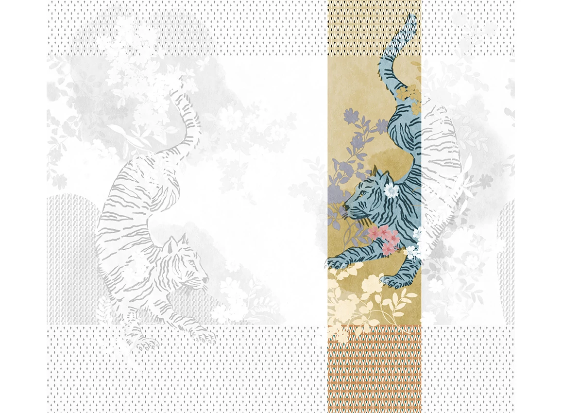 A JV 202 Murals Decor kollekció széles választékát kínálja dekoratív falfestményeknek, amelyekkel egyedi hangulatot és személyre szabott stílust varázsolhat otthonába. Az új témákkal teli kínálat egy lebontási rendszert alkalmaz, amely a kollekció sarokköve a könnyű választás és alkalmazás érdekében. Két tigris méltóságteljesen táncol egy virágos kertben, amelyet egy geometrikus minta keretez, kiemelve a dizájnt. A világos fémes hatás, amely néhány változatban megjelenik, ezüst alapjának köszönhetően dinamizmust és mozgást kölcsönöz.