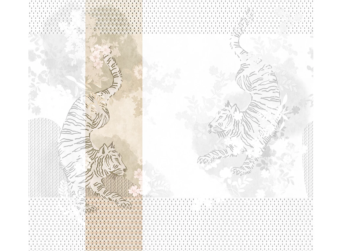 A JV 202 Murals Decor kollekció széles választékát kínálja dekoratív falfestményeknek, amelyekkel egyedi hangulatot és személyre szabott stílust varázsolhat otthonába. Az új témákkal teli kínálat egy lebontási rendszert alkalmaz, amely a kollekció sarokköve a könnyű választás és alkalmazás érdekében. Két tigris méltóságteljesen táncol egy virágos kertben, amelyet egy geometrikus minta keretez, kiemelve a dizájnt. A világos fémes hatás, amely néhány változatban megjelenik, ezüst alapjának köszönhetően dinamizmust és mozgást kölcsönöz.