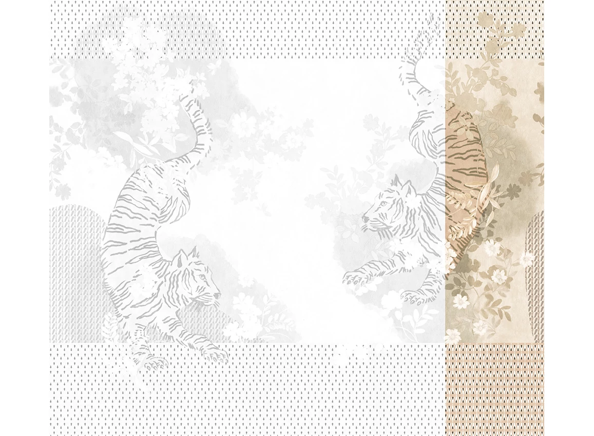 A JV 202 Murals Decor kollekció széles választékát kínálja dekoratív falfestményeknek, amelyekkel egyedi hangulatot és személyre szabott stílust varázsolhat otthonába. Az új témákkal teli kínálat egy lebontási rendszert alkalmaz, amely a kollekció sarokköve a könnyű választás és alkalmazás érdekében. Két tigris méltóságteljesen táncol egy virágos kertben, amelyet egy geometrikus minta keretez, kiemelve a dizájnt. A világos fémes hatás, amely néhány változatban megjelenik, ezüst alapjának köszönhetően dinamizmust és mozgást kölcsönöz.