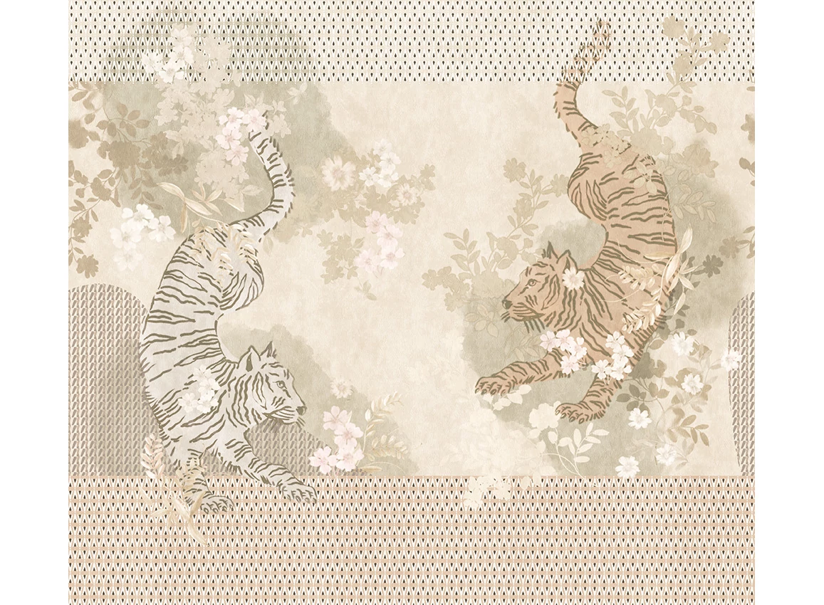 A JV 202 Murals Decor kollekció széles választékát kínálja dekoratív falfestményeknek, amelyekkel egyedi hangulatot és személyre szabott stílust varázsolhat otthonába. Az új témákkal teli kínálat egy lebontási rendszert alkalmaz, amely a kollekció sarokköve a könnyű választás és alkalmazás érdekében. Két tigris méltóságteljesen táncol egy virágos kertben, amelyet egy geometrikus minta keretez, kiemelve a dizájnt. A világos fémes hatás, amely néhány változatban megjelenik, ezüst alapjának köszönhetően dinamizmust és mozgást kölcsönöz.