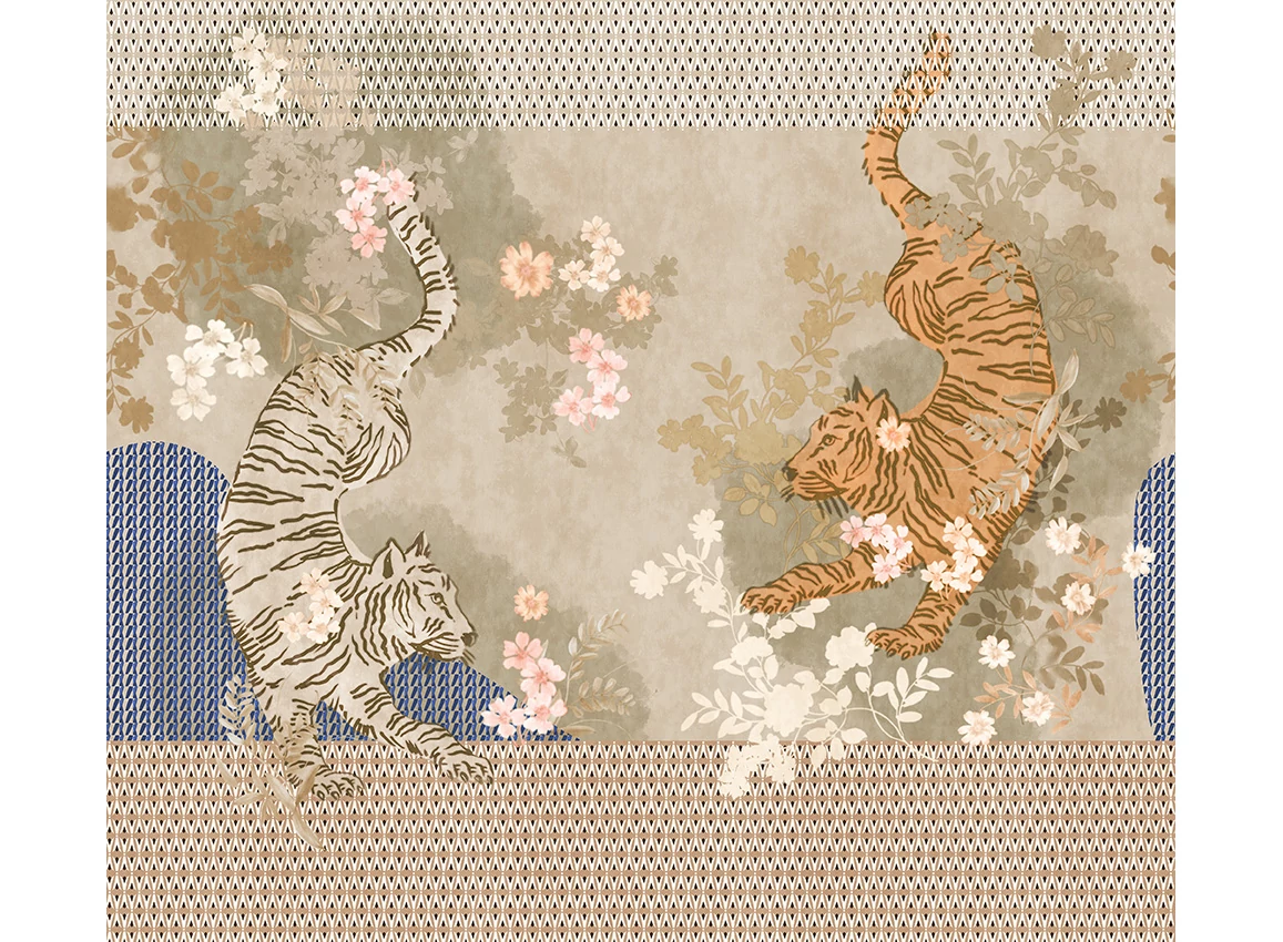 A JV 202 Murals Decor kollekció széles választékát kínálja dekoratív falfestményeknek, amelyekkel egyedi hangulatot és személyre szabott stílust varázsolhat otthonába. Az új témákkal teli kínálat egy lebontási rendszert alkalmaz, amely a kollekció sarokköve a könnyű választás és alkalmazás érdekében. Két tigris méltóságteljesen táncol egy virágos kertben, amelyet egy geometrikus minta keretez, kiemelve a dizájnt. A világos fémes hatás, amely néhány változatban megjelenik, ezüst alapjának köszönhetően dinamizmust és mozgást kölcsönöz.