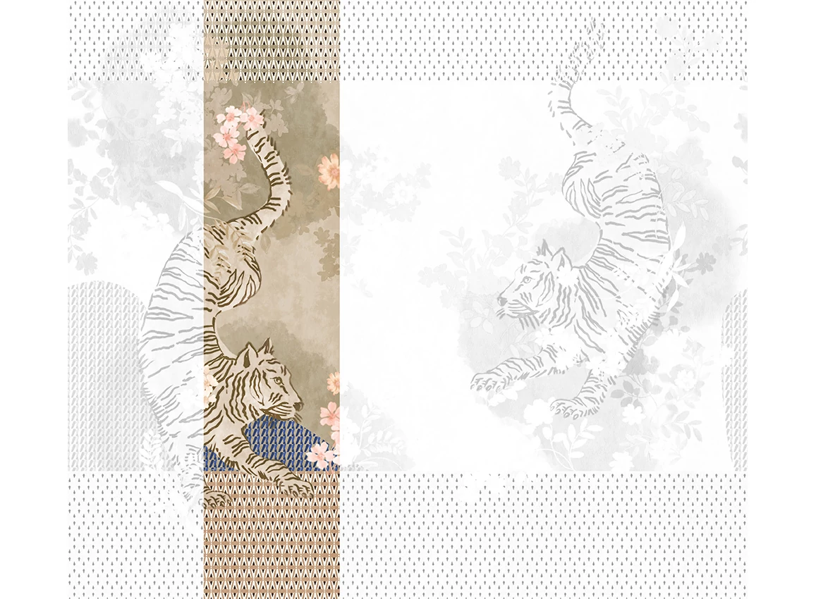A JV 202 Murals Decor kollekció széles választékát kínálja dekoratív falfestményeknek, amelyekkel egyedi hangulatot és személyre szabott stílust varázsolhat otthonába. Az új témákkal teli kínálat egy lebontási rendszert alkalmaz, amely a kollekció sarokköve a könnyű választás és alkalmazás érdekében. Két tigris méltóságteljesen táncol egy virágos kertben, amelyet egy geometrikus minta keretez, kiemelve a dizájnt. A világos fémes hatás, amely néhány változatban megjelenik, ezüst alapjának köszönhetően dinamizmust és mozgást kölcsönöz.