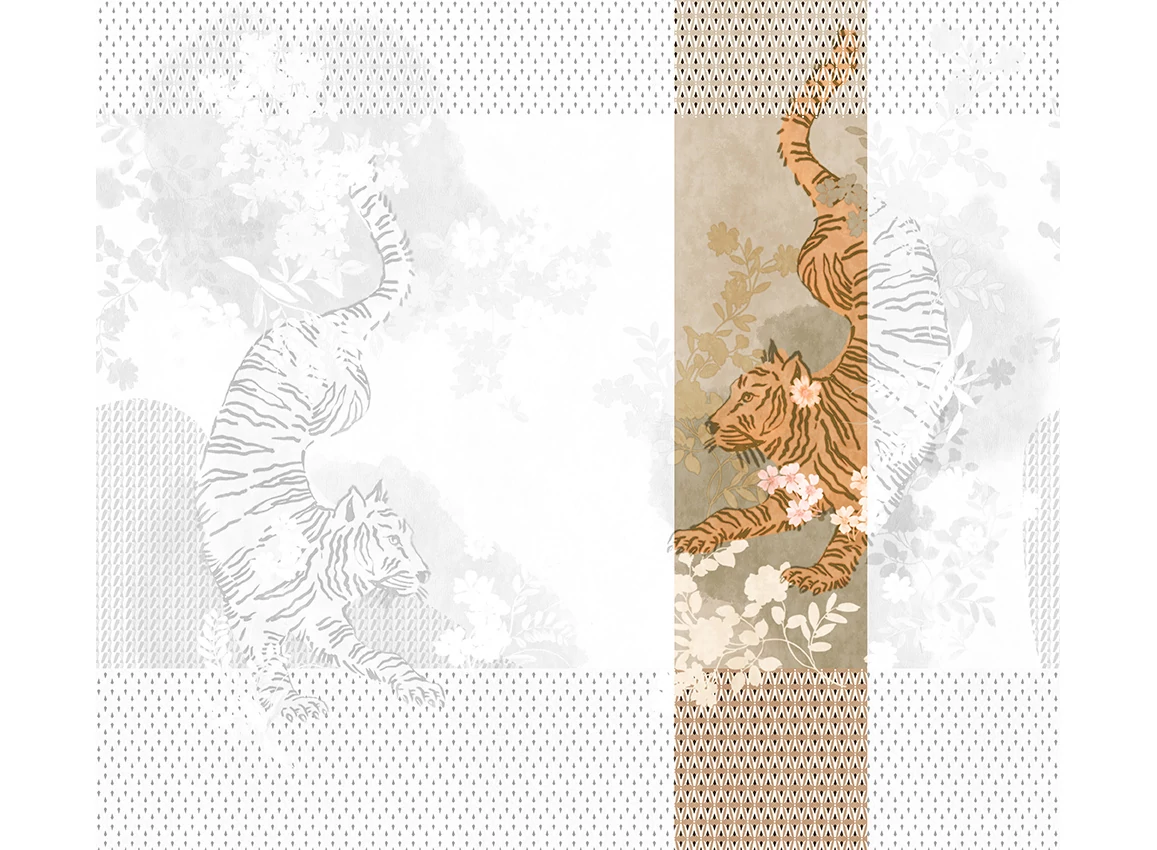 A JV 202 Murals Decor kollekció széles választékát kínálja dekoratív falfestményeknek, amelyekkel egyedi hangulatot és személyre szabott stílust varázsolhat otthonába. Az új témákkal teli kínálat egy lebontási rendszert alkalmaz, amely a kollekció sarokköve a könnyű választás és alkalmazás érdekében. Két tigris méltóságteljesen táncol egy virágos kertben, amelyet egy geometrikus minta keretez, kiemelve a dizájnt. A világos fémes hatás, amely néhány változatban megjelenik, ezüst alapjának köszönhetően dinamizmust és mozgást kölcsönöz.