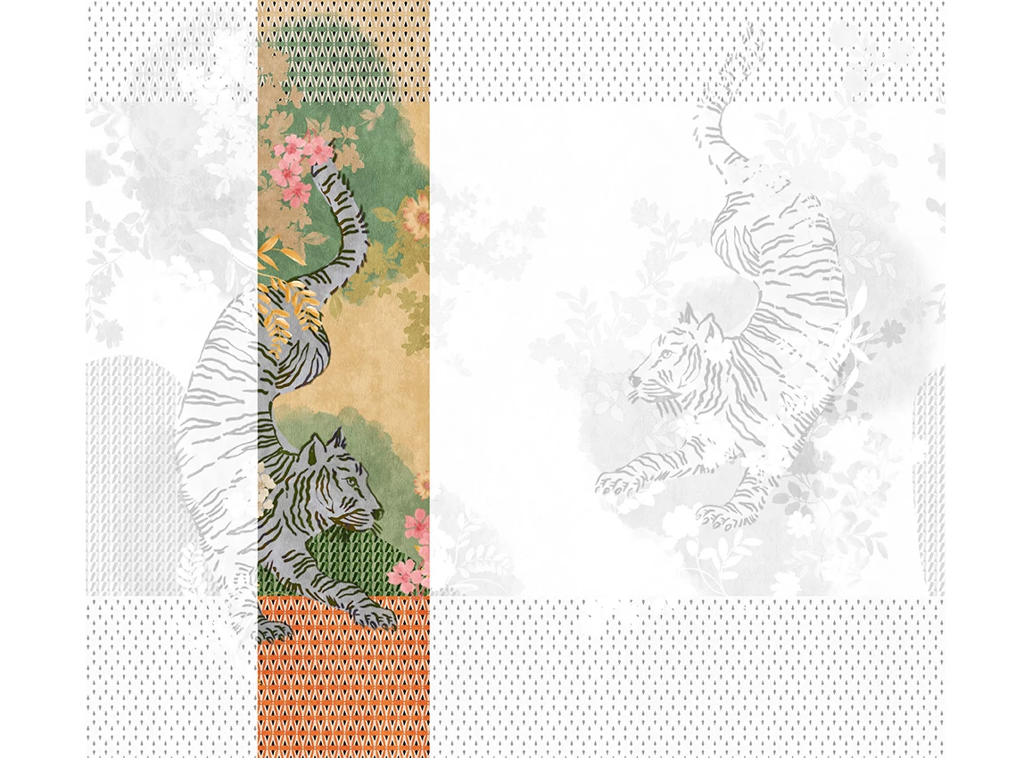 A JV 202 Murals Decor kollekció széles választékát kínálja dekoratív falfestményeknek, amelyekkel egyedi hangulatot és személyre szabott stílust varázsolhat otthonába. Az új témákkal teli kínálat egy lebontási rendszert alkalmaz, amely a kollekció sarokköve a könnyű választás és alkalmazás érdekében. Két tigris méltóságteljesen táncol egy virágos kertben, amelyet egy geometrikus minta keretez, kiemelve a dizájnt. A világos fémes hatás, amely néhány változatban megjelenik, ezüst alapjának köszönhetően dinamizmust és mozgást kölcsönöz.