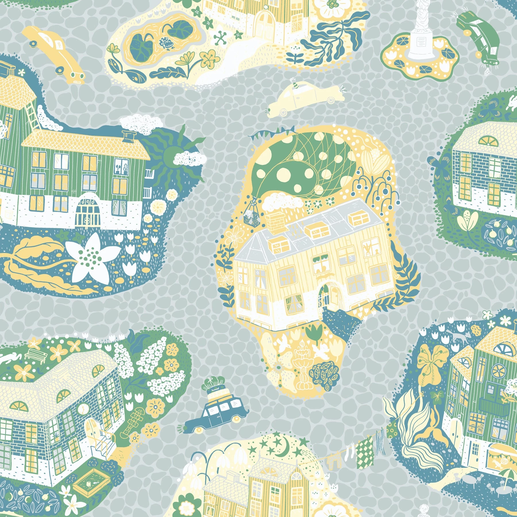 Élvezze az autózást macskaköves utcákon keresztül a legelbűvölőbb városon át! Az illusztratív mintázat különféle autókat ábrázol, amint bájos negyedeken haladnak át, minden otthon egyedi kerttel és váratlan meglepetésekkel várja a látogatót.