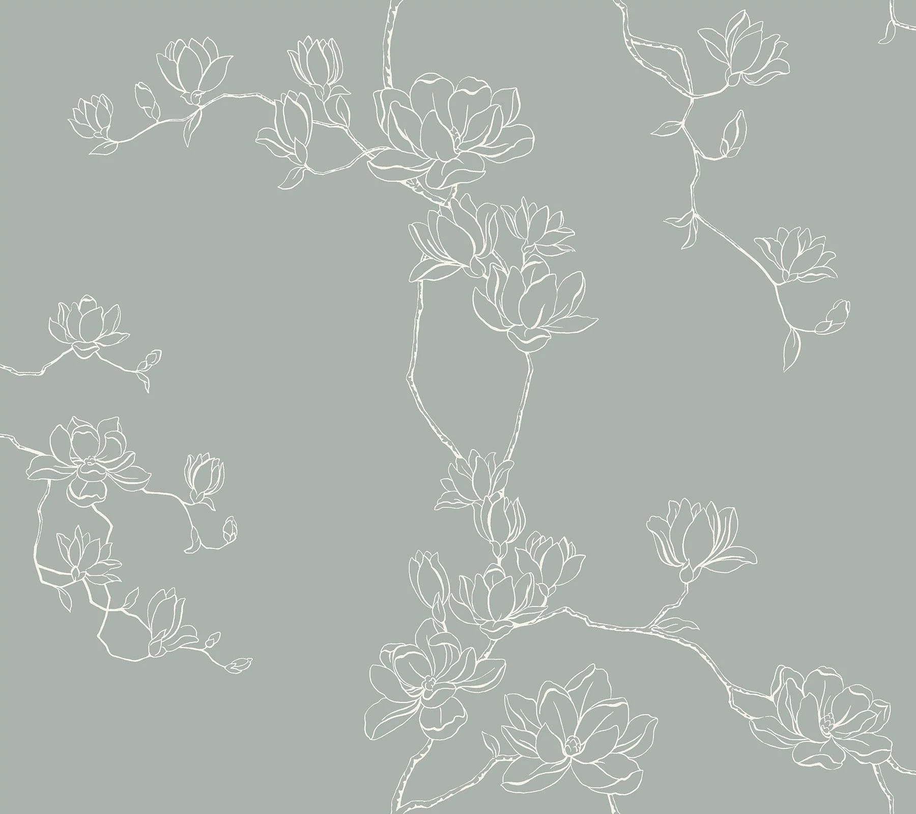 Finom ágak, melyeket dús magnólia virágok borítanak, fehér kontúrral vannak kiemelve a kékeszöld háttéren, hogy megmutassák a virág könnyed, egyszerű szépségét.